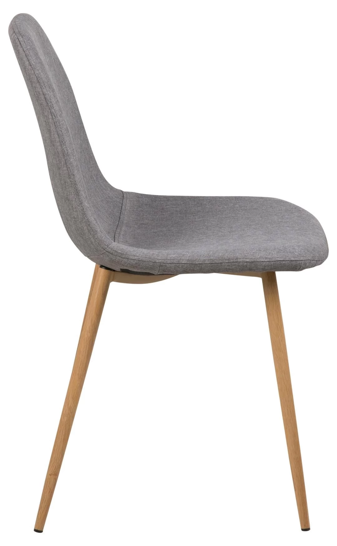 Eetkamerstoel Wilhelm, samengesteld uit lichtgrijze stof en metalen poten in eikdecor.