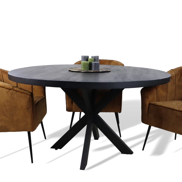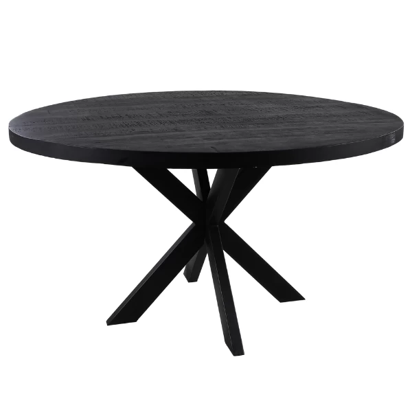 Ronde eettafel Geraldton met een diameter van 140cm. Tafelblad uit zwart mangohout met metalen onderstel.