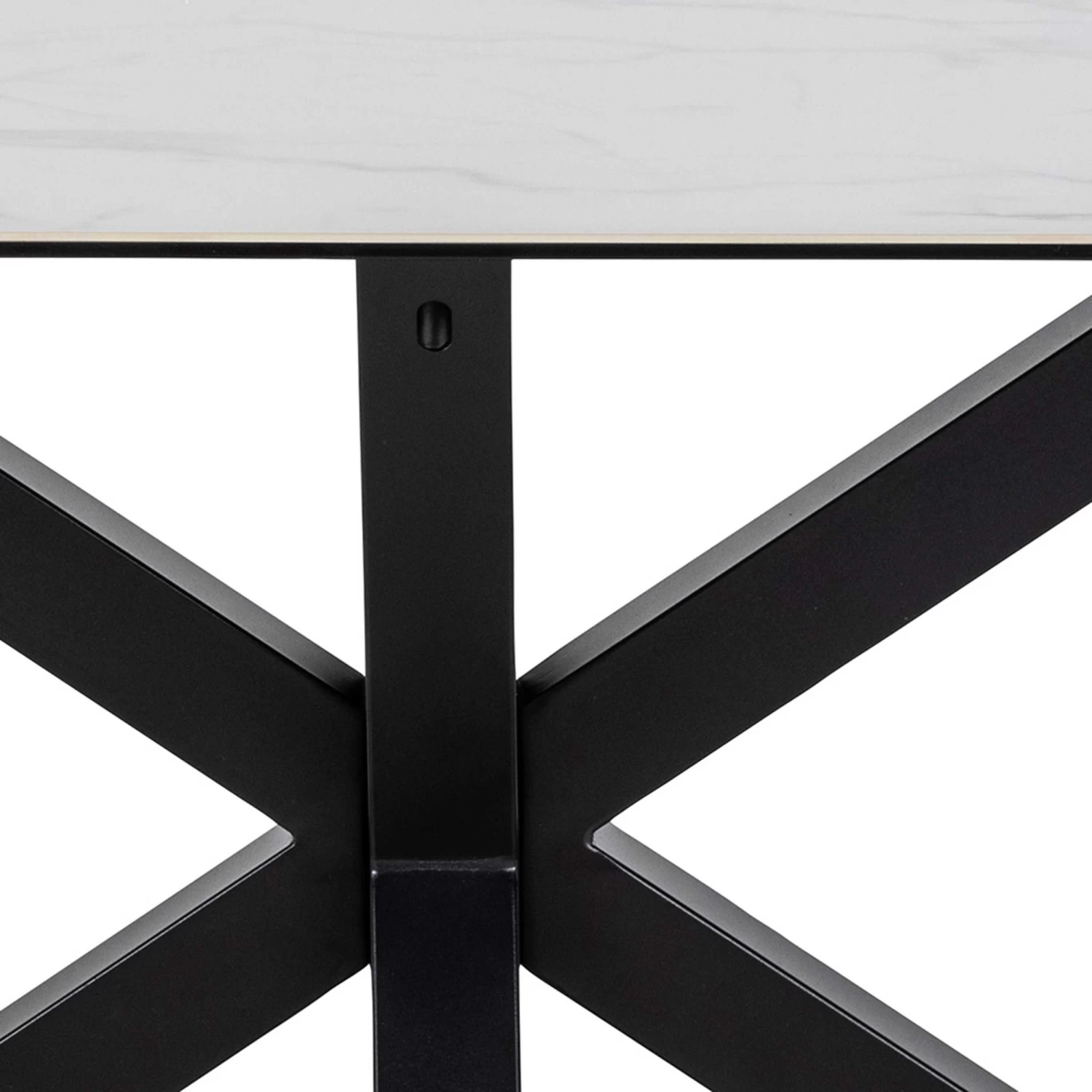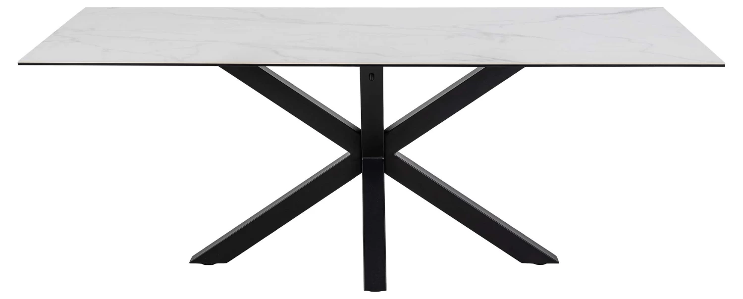 Eettafel Hennie, 200×100 cm, met wit tafelblad uit keramiek en matzwarte metalen kruispoot.