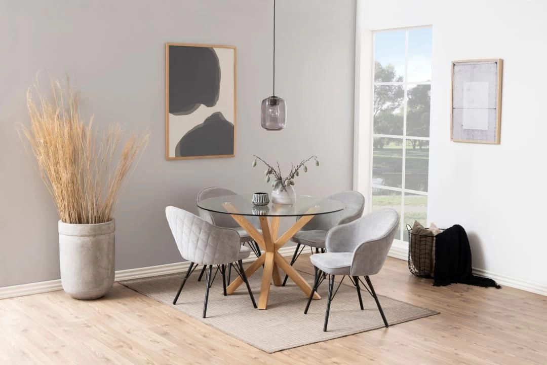 Met de Hennie eettafel geef je je eetkamer meteen een speciale toets. Deze eettafel heeft een speciaal design dankzij de kruispoot uit metaal. De poot is afgewerkt met een papieren folie in eiken decor. Het tafelblad uit doorzichtig glas zorgt voor de perfecte combinatie. Deze Hennie eettafel beschikt over een diameter van 119 cm en is geschikt voor vier personen.