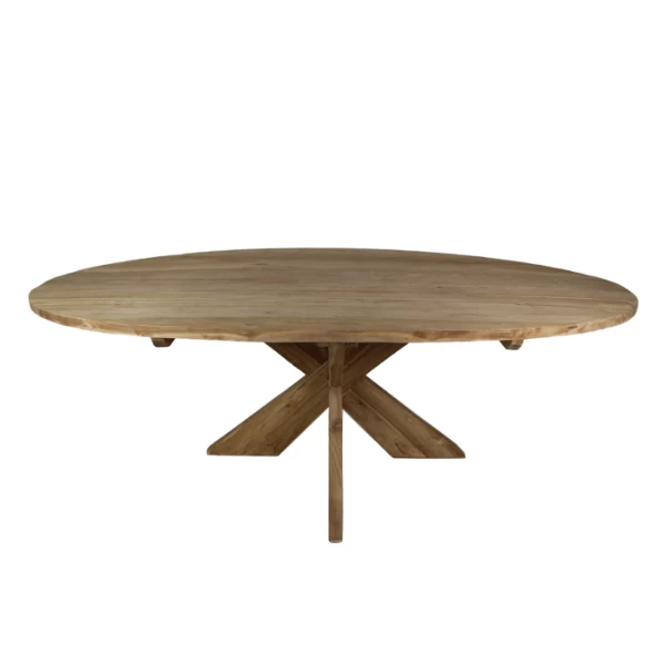 Ovale eettafel met kruispoot, gemaakt uit teakhout. Onbehandeld tafelblad (dikte van 35 mm) met natuurlijke houtpatronen. Tafel voor 6 personen.