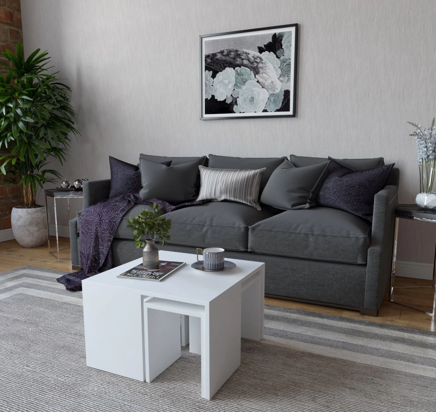 Elegance salontafel set: 100% gemelamineerd spaanplaat, 18 mm dik, 60 cm breed, 36 cm hoog. Ontworpen in een strakke witte kleur