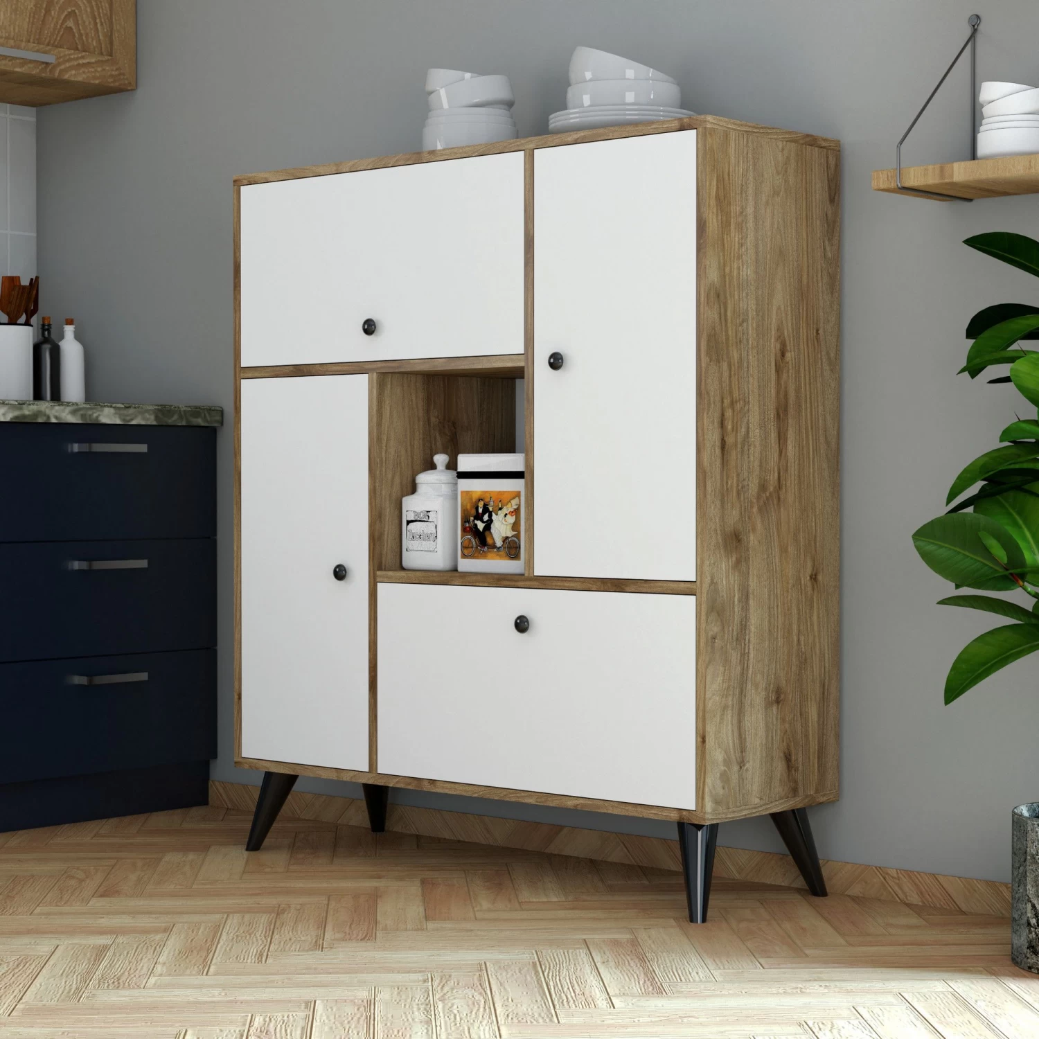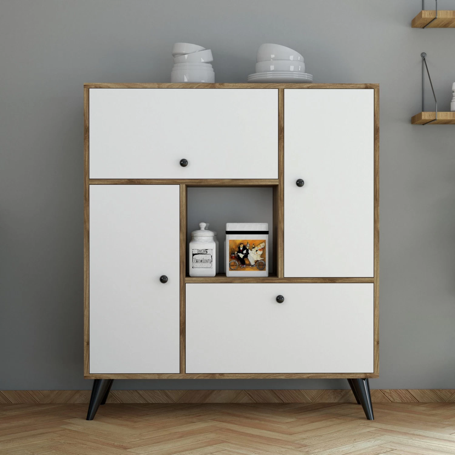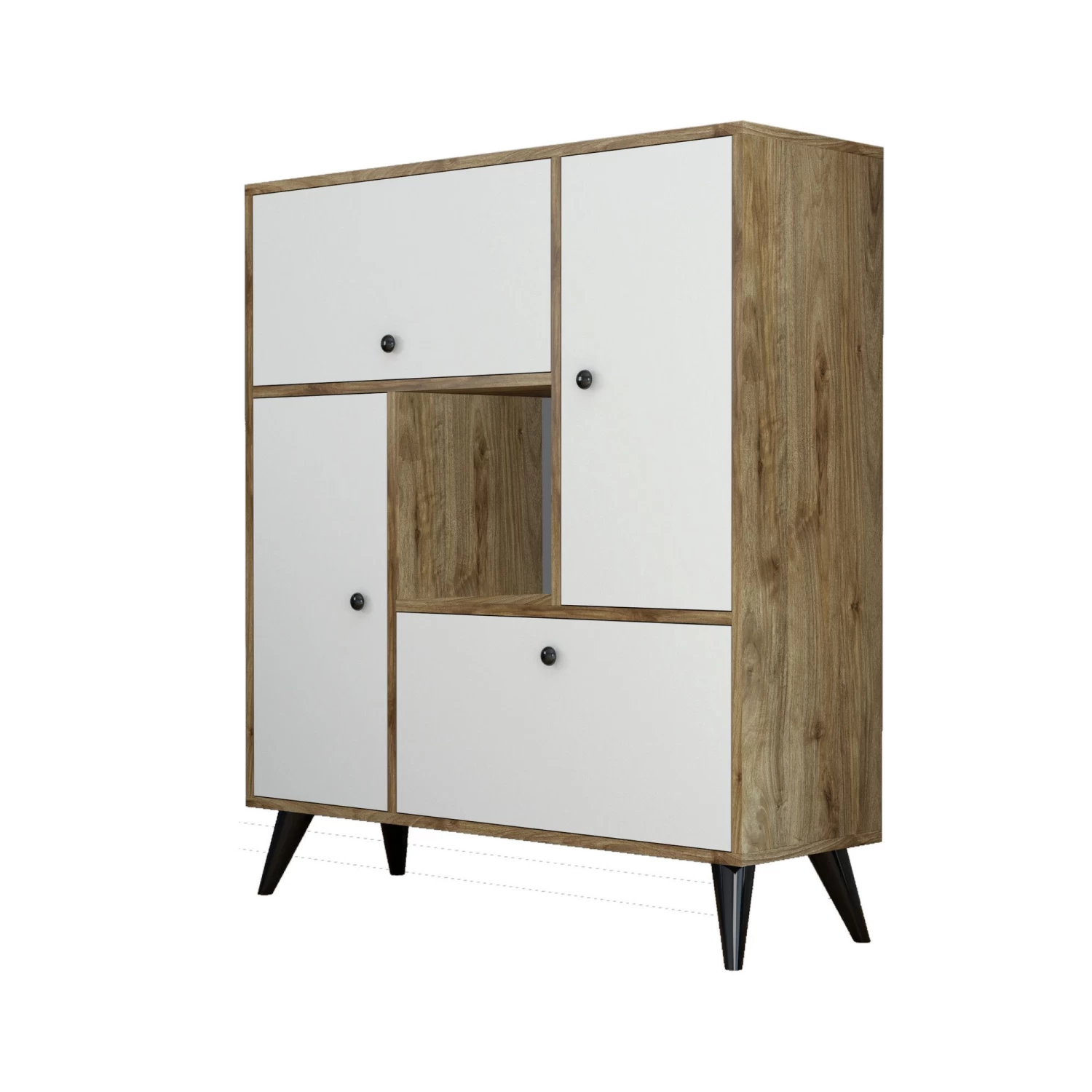 Verfraai je woonkamer met deze stijlvolle multifunctionele kast. Het biedt veel opbergruimte, meerdere planken en kan aan de muur worden bevestigd. Gemaakt van 100% gemelamineerd spaanplaat met een strakke afwerking van wit walnoot. Afmetingen: 105cm B x 120cm H x 35cm D