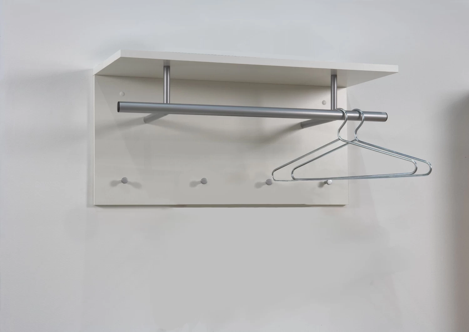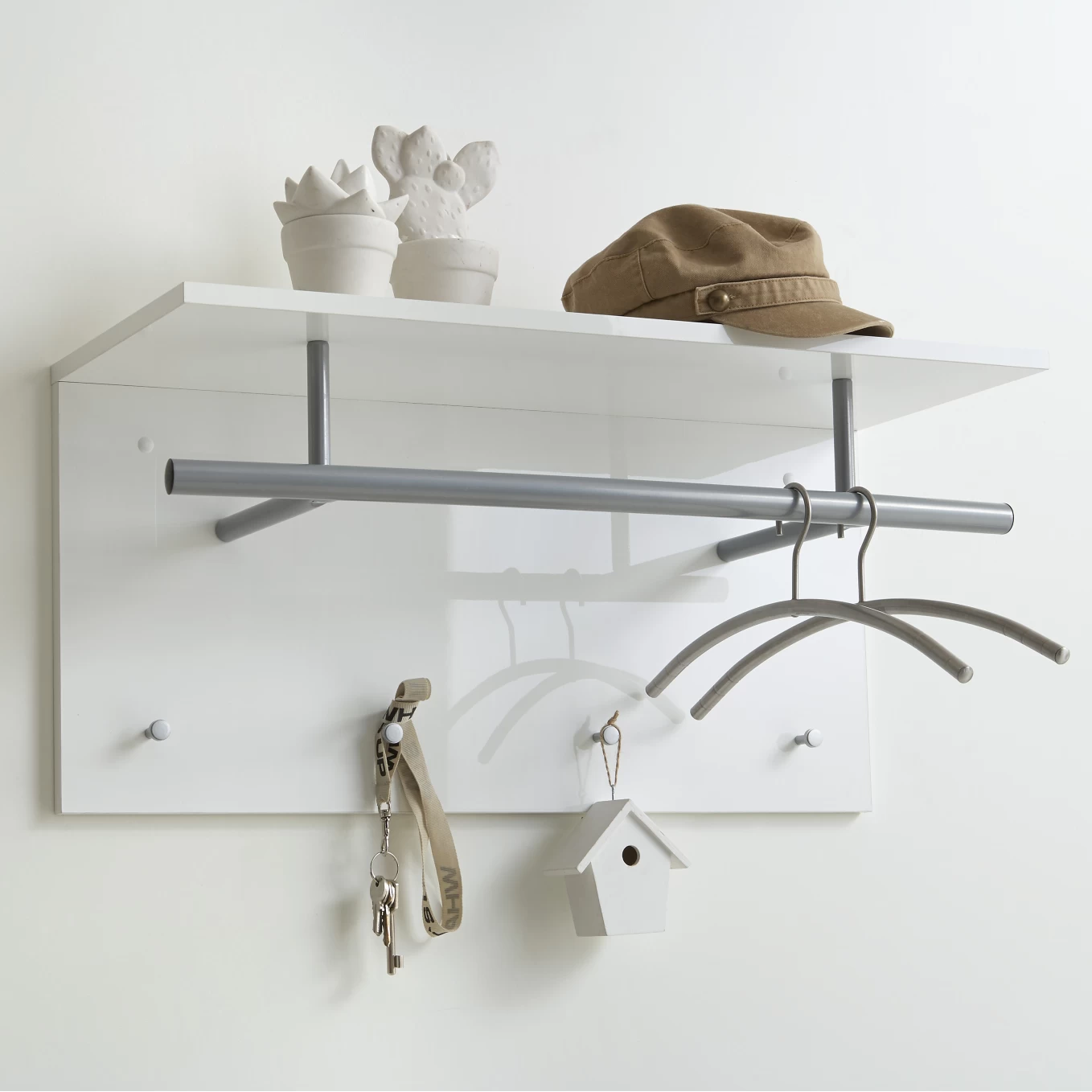 Kapstok Spot past dankzij z’n compacte afmetingen zelfs in de kleinste inkomhal. Je bevestigt hem heel eenvoudig aan de muur. Deze kapstok in hoogglans wit bestaat uit een legplank, een kledingroede en 4 kledinghaakjes.Â