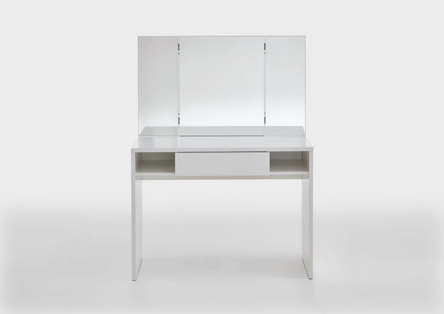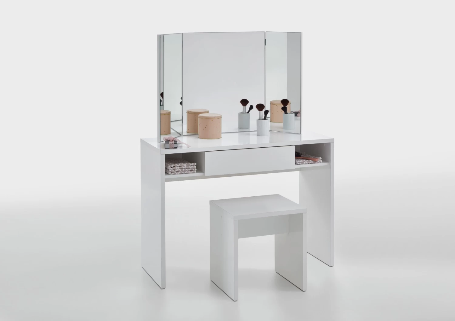 Kaptafel Schminki biedt je alles wat je nodig hebt zonder overbodige details: een grote spiegel waarvan je de zijkanten kan draaien, een ruime lade en 2 open vakjes. Deze kaptafel met minimalistisch design is afgewerkt in hoogglans wit en past perfect in elke slaapkamer.