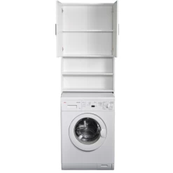 Witte badkamerkast voor wasmachine, gemaakt van spaanplaat.