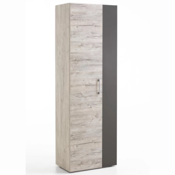 De kleerkast Nala met decor van grijze eik is afgewerkt met een donkergrijs accent. Die stijlvolle kleurencombinatie past perfect in elk modern interieur. Binnenin beschikt de kast over 6 opbergvakken. De kleerkast is vervaardigd uit spaanplaat. Ontdek de volledige collectie Nala op onze site!
