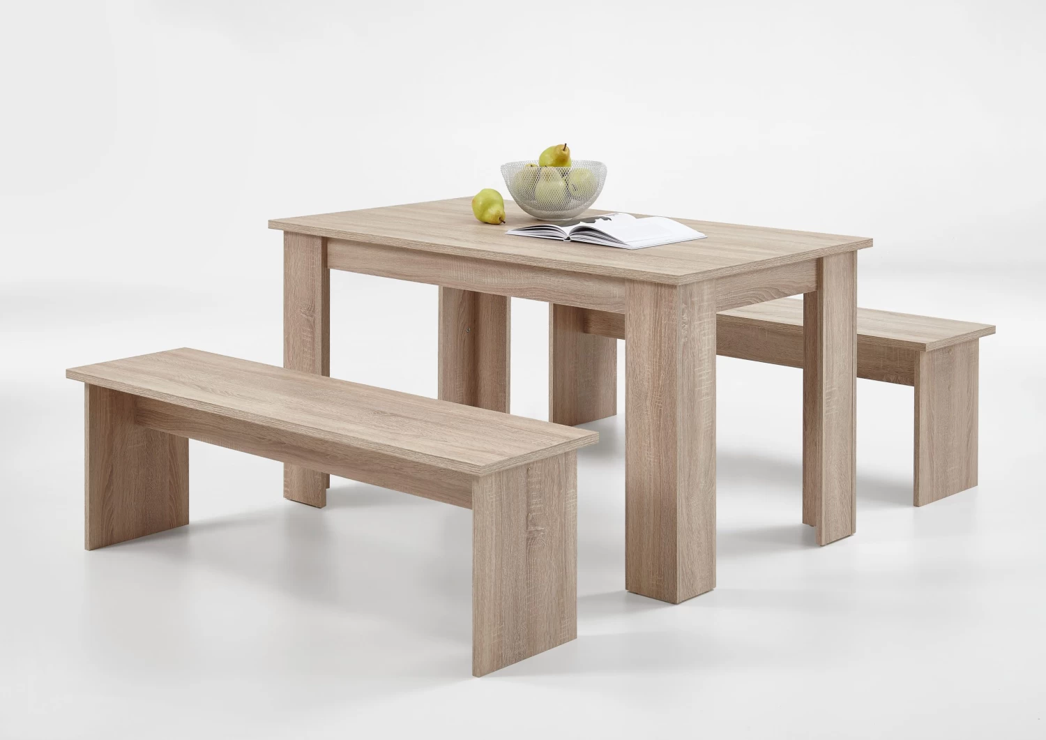 Een originele eetplaats creëer je in geen tijd met de set Mundo. De set bestaat uit een rechthoekige eettafel en 2 bijpassende zitbanken. De meubels zijn vervaardigd uit spaanplaat met eikenhouten look.