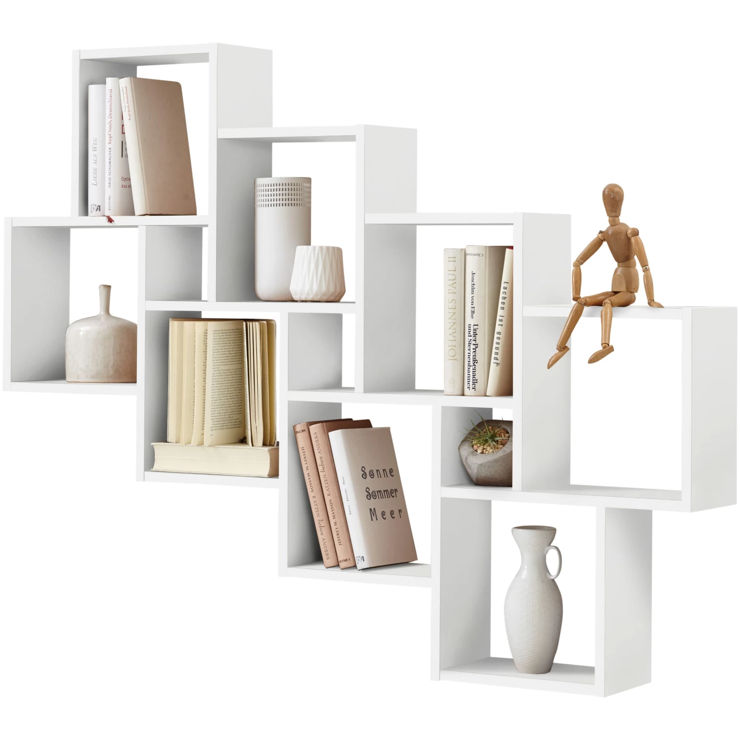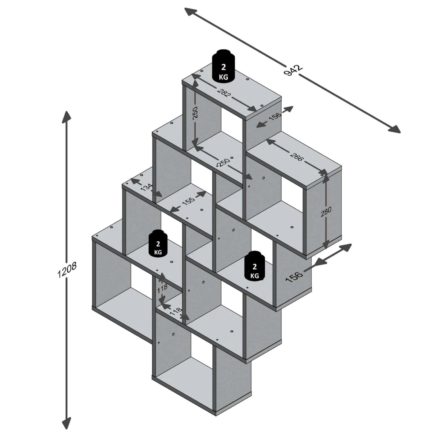 Dankzij zijn asymmetrische indeling heeft het wandrek Lauren een op en top originele uitstraling. Het rek telt 8 grote opbergvakken en 3 kleinere vakjes. Je kan er je mooiste decoratie, boeken en andere spullen op plaatsen. Het wandrek is vervaardigd uit spaanplaat met glanzend witte afwerking. Ook in andere kleuren te verkrijgen.