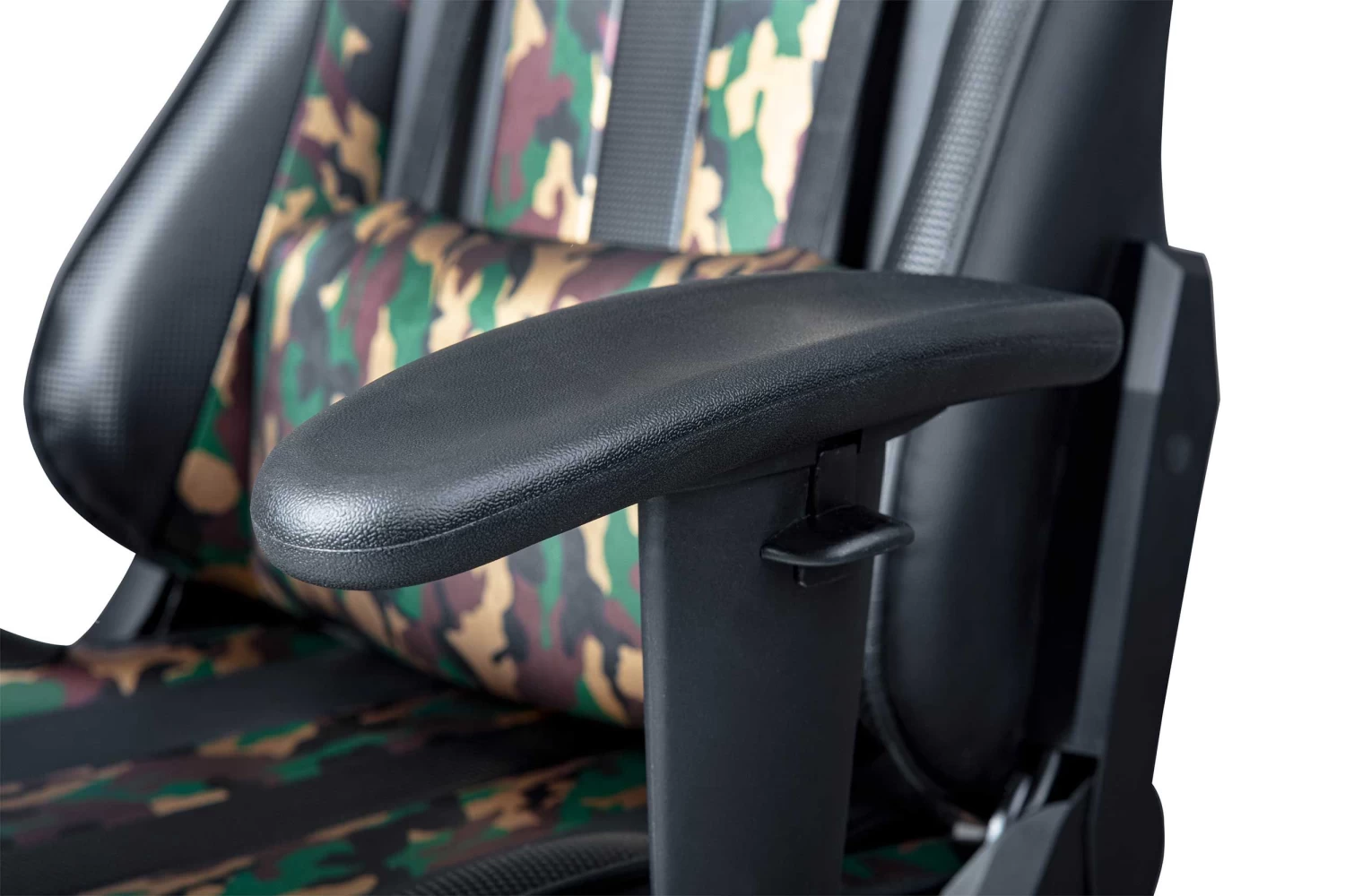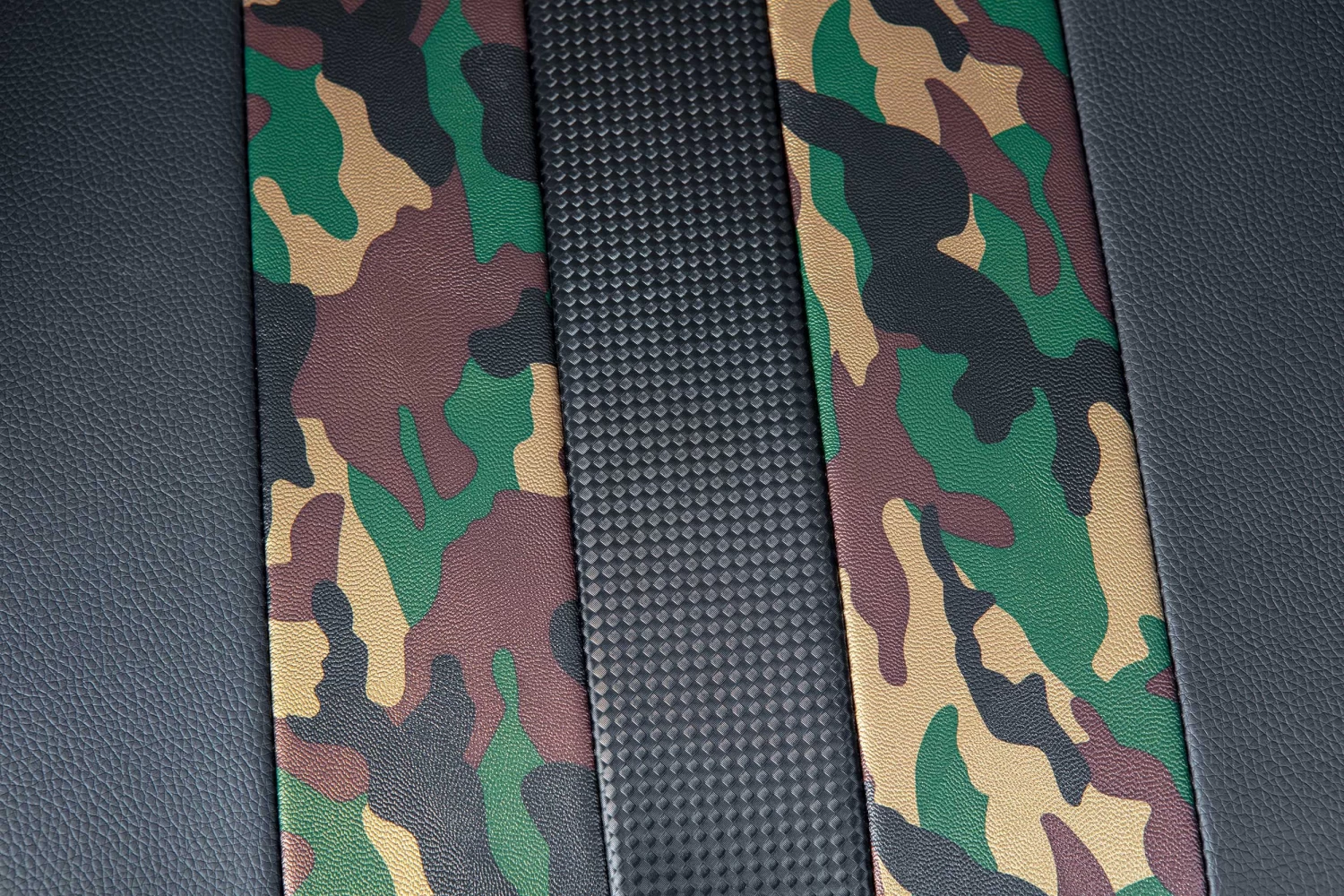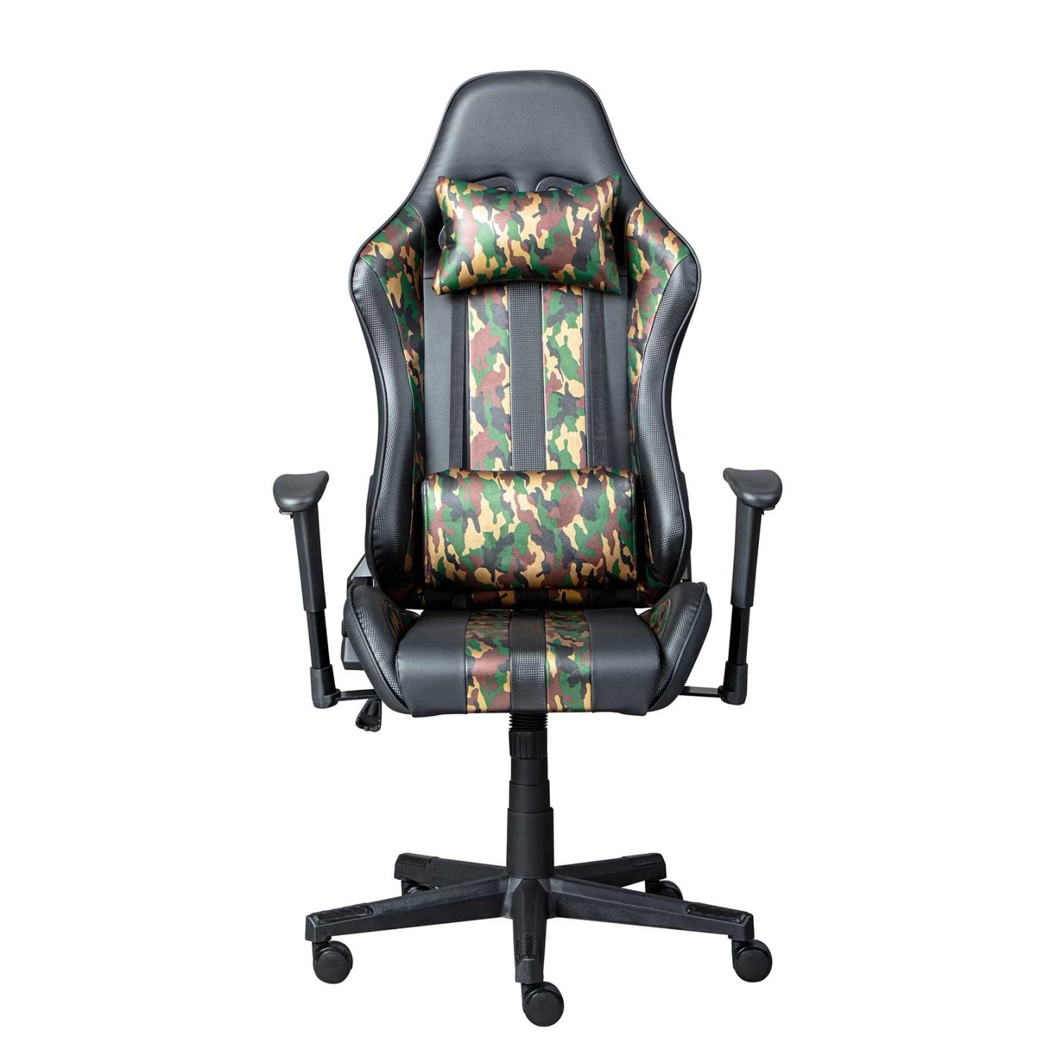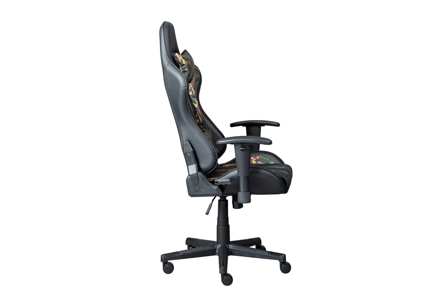 Gamestoel Action Hero, gemaakt uit kunststof met een vulling van polyurethaan en een bekleding van kunstleer in het zwart met legerprint.
