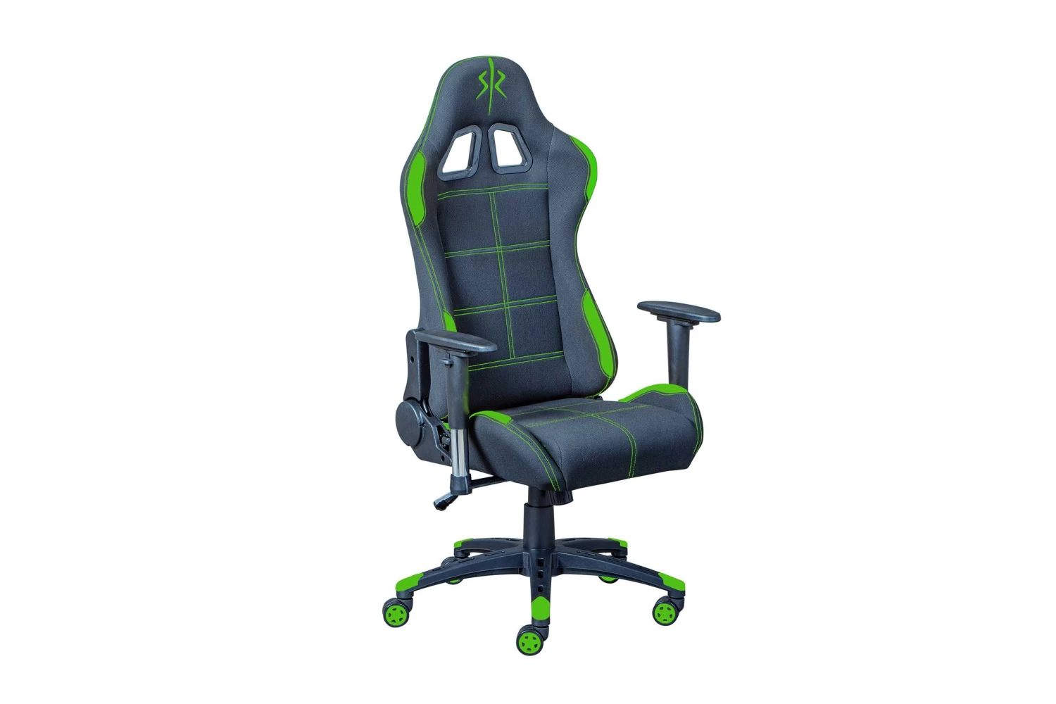 Gamestoel Roger, uitgerust met wieltjes en armleuningen. Bekleed met zwarte stof met groene details.Â