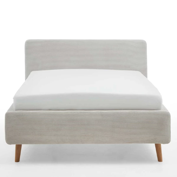 Bed Madras 221x161x105cm met bekleding in beige ribfluweel met houten pootjes. Geschikt voor matras en lattenbodem van 140x200cm, beide niet inbegrepen.