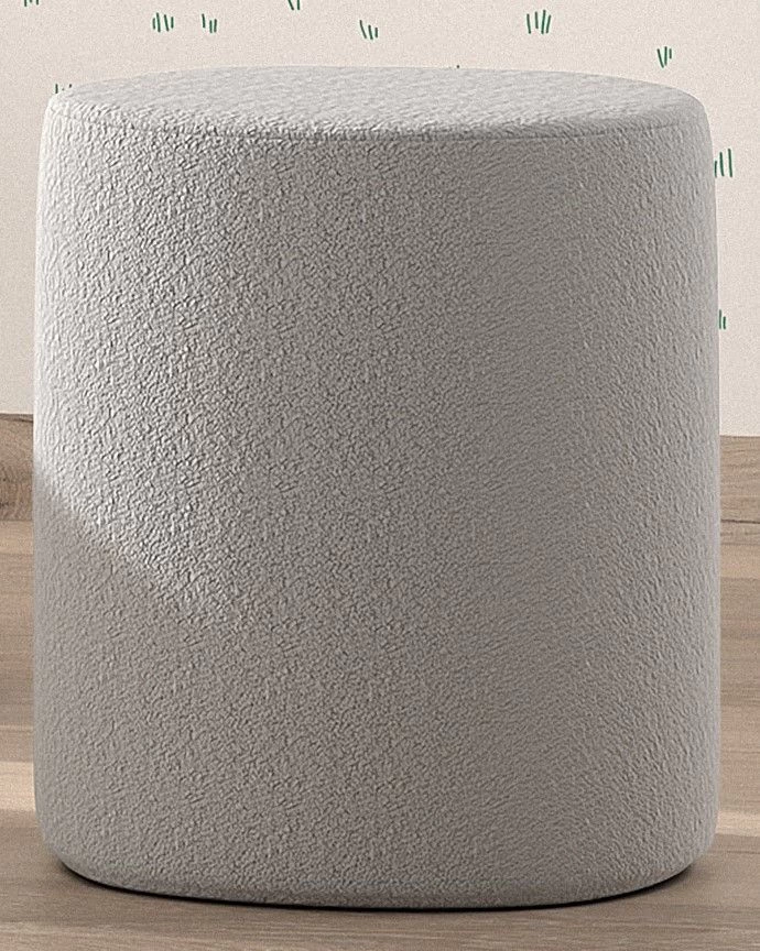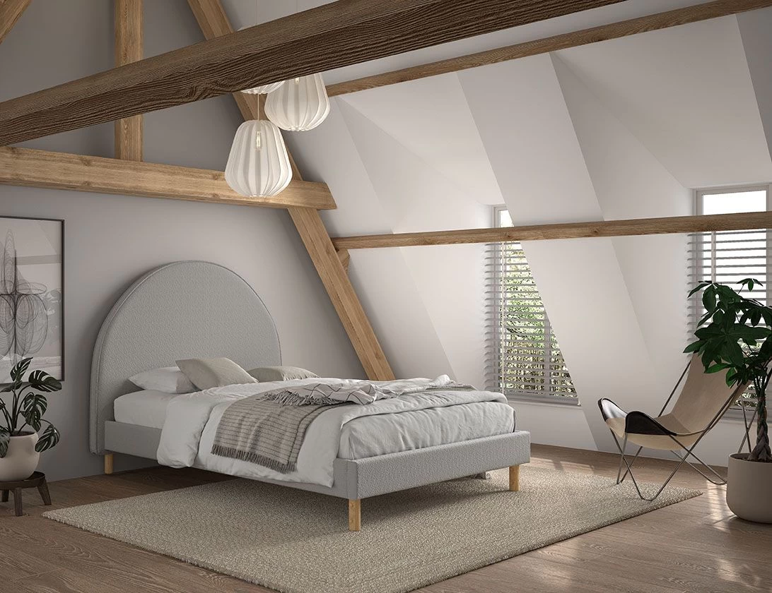 Twijfelaarbed Maeva 213x148x132cm met twee poefs ø41×41,5cm uit spaanplaat, bekleed met grijze bouclé stof. Voorzien van een lattenbodem van 140x200cm. Matras niet inbegrepen.