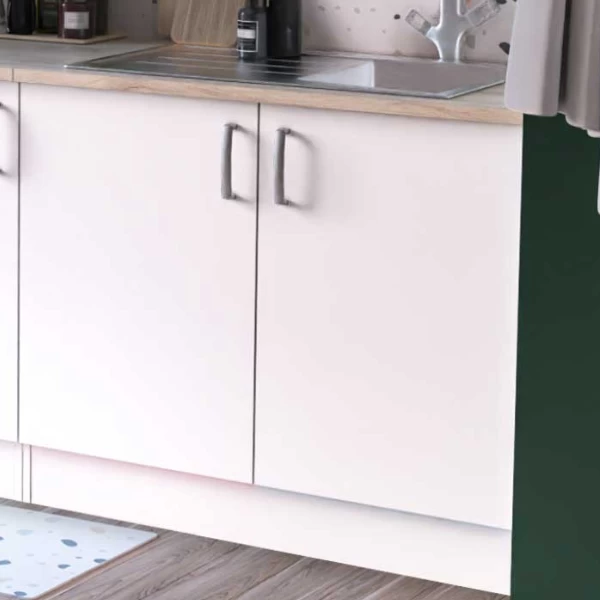 Deze neutrale mat witte onderkast krijgt karakter door zijn natuurlijk ogende werkblad in prachtig Kronberg eikdecor. Deze kast beschikt 2 draaideuren met daarachter opbergruimte voor afwasmiddel, vaatdoeken, etc. De spoelbak en de schroeven en pluggen voor muurbevestiging zijn niet inbegrepen.