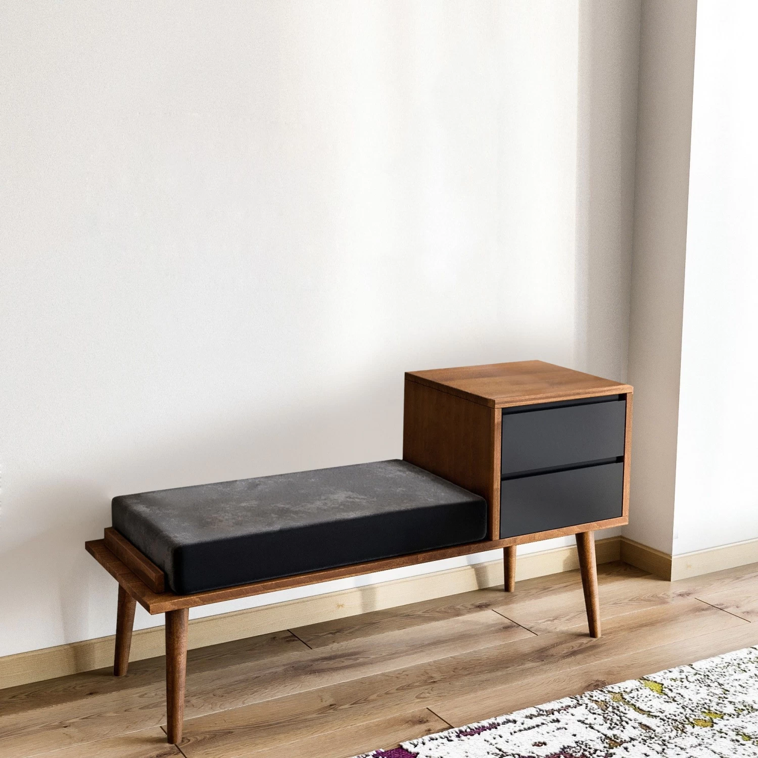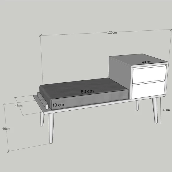 Halbank Sabrina is gemaakt uit gemelamineerde spaanplaat met antracieten decor en walnootdecor. het bankje heeft een zitkussen in 52 DNS schuim en 2 lades met telescopische ladegeleiders.