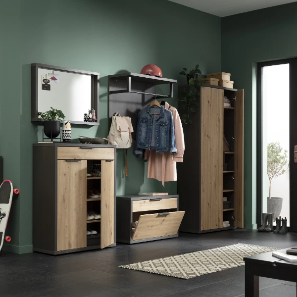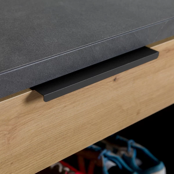 Met de meubels uit de collectie Sento geniet je van een opgeruimde hal of berging, zonder aan stijl in te boeten. Dit halbankje is gemaakt uit gerecycleerde spaanplaat, afgewerkt met melamine. Het warme eikdecor vormt een mooi contrast met het antraciet dat perfect past in de industriële woonstijl. De zwarte handgrepen zorgen voor een modern, maar robuuste touch. Achter de opklapdeur heb je plaats voor een 3 à 4-tal paar schoenen. Dankzij de opberglade heb je ook ruimte voor allerlei kleine spullen, bijvoorbeeld schoenpoetsgerief. Combineer met de andere meubels uit de collectie Sento voor een harmonieus geheel.