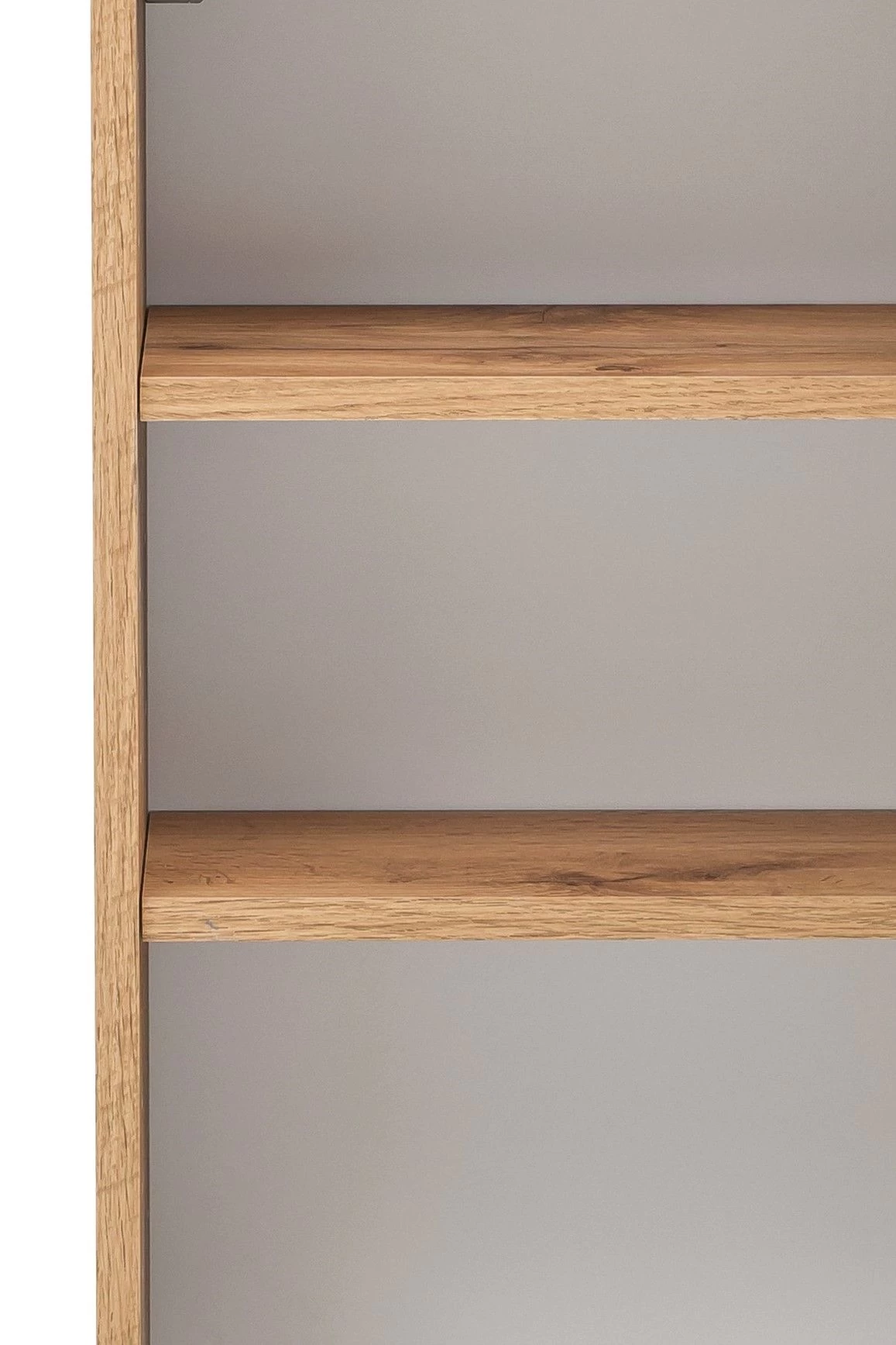 Hangkast Kornel/Luna in eikdecor, met 1 grijze deur en 2 legplanken. Gemaakt van spaanplaat met een laagje melamine.