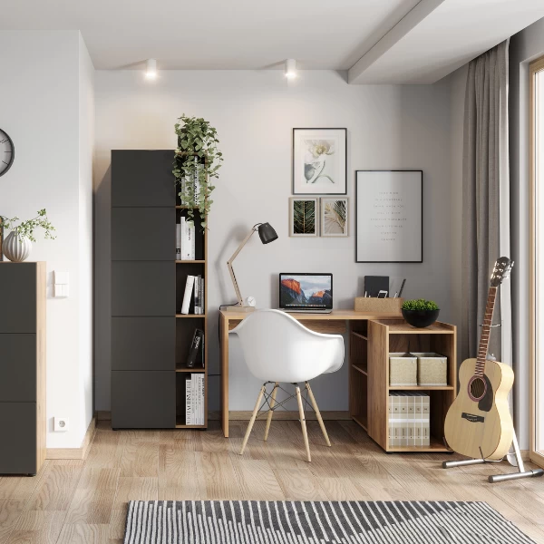 Je (thuis)bureau inrichten kan lastig zijn, want je hebt heel wat opbergruimte nodig en vaak weinig plaats. De collectie Oliveira biedt soelaas. De combinatie van het warme eikdecor en mat antraciet zorgen ervoor dat deze collectie perfect past binnen de industriële stijl. Dit bureau is gemaakt uit spaanplaat en is afgewerkt met melamine. Het hoekbureau beschikt over een ruim werkblad en over heel wat opbergvakken aan de zijkant. Dankzij het slimme ontwerp creëer je een functionele werkplek, die niet veel plaats inneemt. De bureau kan ook in spiegelbeeld gemonteerd worden. Ontdek ook de bijpassende meubels uit onze Oliveira-collectie.
