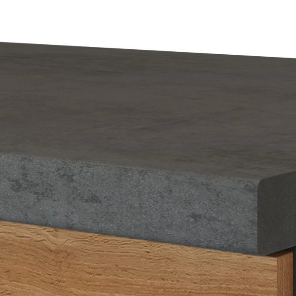 Hoekkast Sorrella 110x60x85cm uit spaanplaat met metalen handgrepen. Afgewerkt met melamine in eikdecor en grafiet. Met een werkblad in HPL.Â