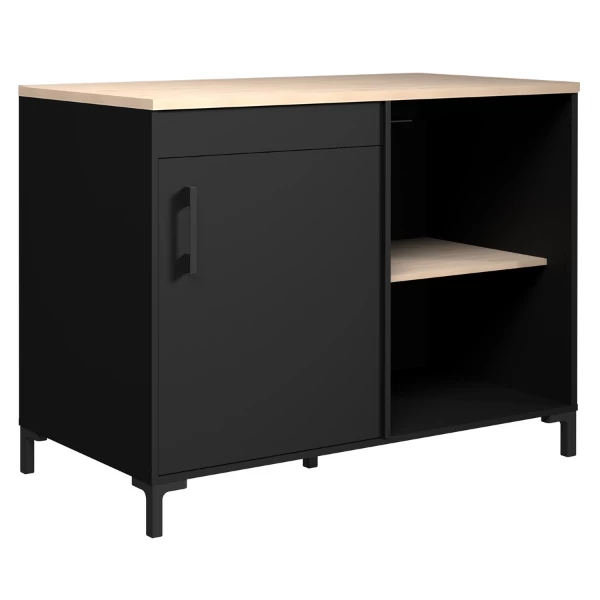 Hoekonderkast Cobalt 120x60x90cm uit spaanplaat met afwerking in zwart en eikdecor. Voorzien van een legplank in eikdecor.