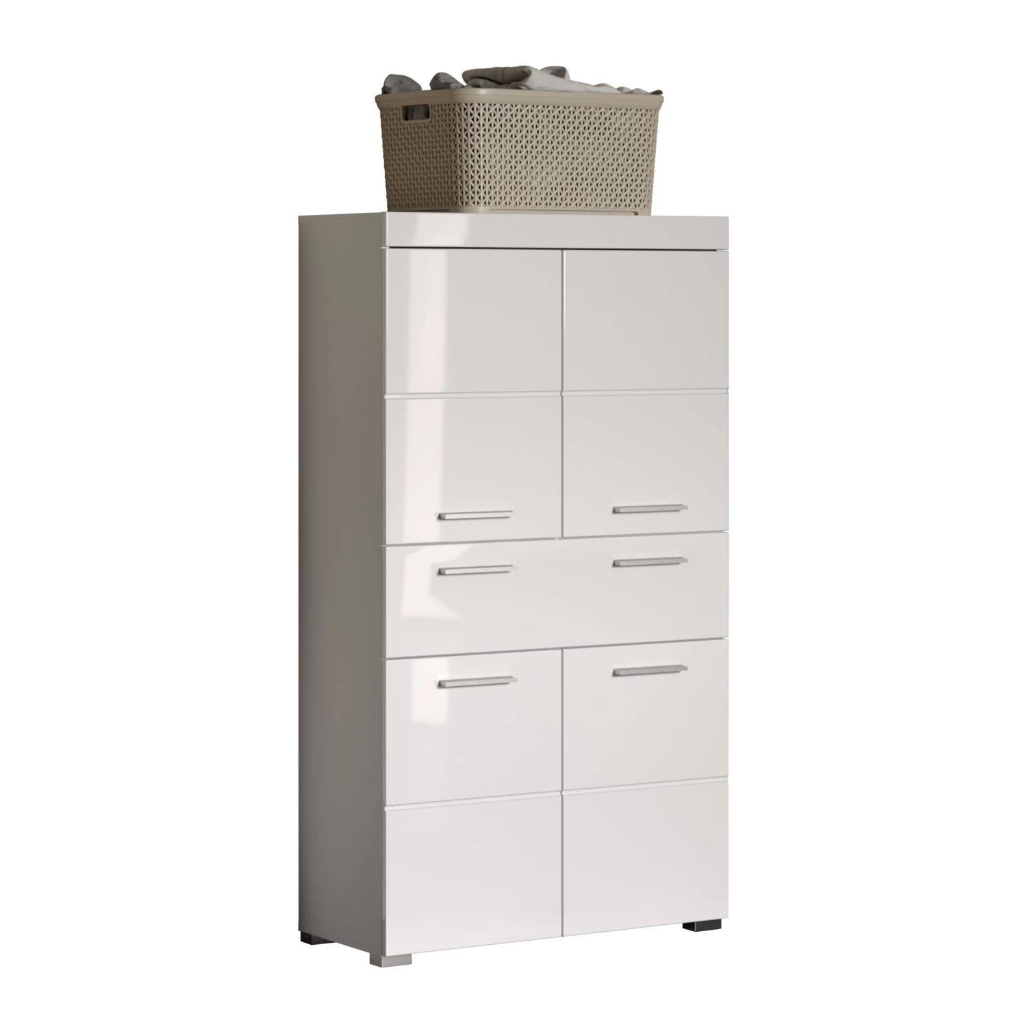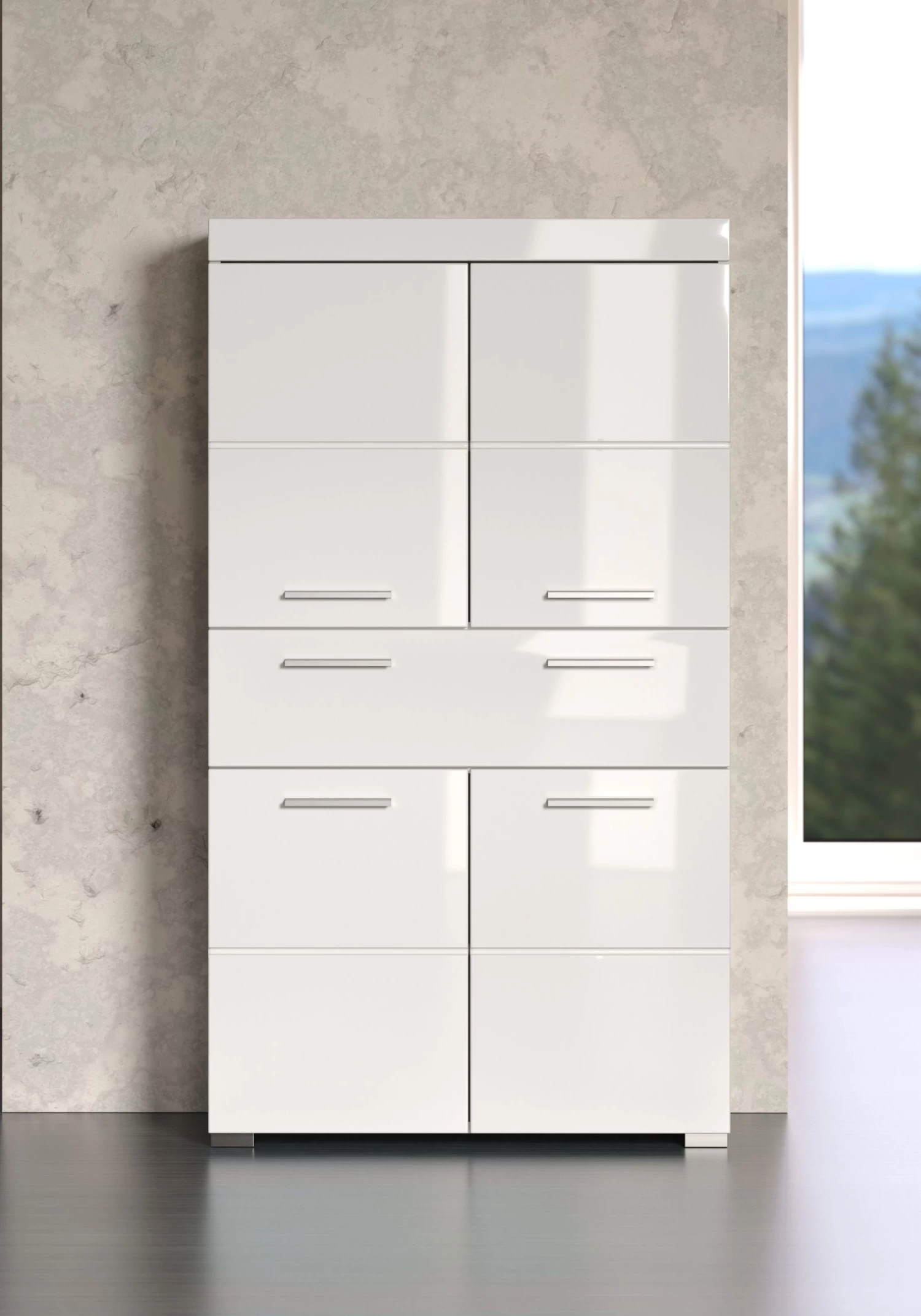 De witte romp van het meubel past naadloos bij je bestaande meubels, terwijl de zilverkleurige handgrepen een vleugje elegantie toevoegen. Het gebruik van decoratieve folie en melamine zorgt voor een duurzaam en robuust oppervlak dat bestand is tegen dagelijks gebruik.