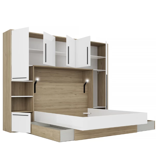 Tweepersoonsbed Moloko 160 x 200 cm + Hoofdbord met kast voor bed Moloko 275x44x216cm  uit spaanplaat met afwerking in hoogglans wit en imitatie-eik. De kast bestaat uit 6 deuren, 5 legplanken en 1 kledingroede. Het bed is geschikt voor een matras van 160 x 200 cm. Matras, matrasbodem, bedlades en leeslampen niet inbegrepen.Â