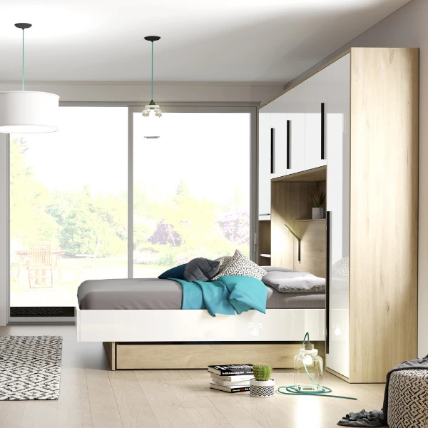 Met de veelzijdige collectie Moloko haal je het meeste uit je slaapkamer. Dankzij het strakke ontwerp en de afwerkingen in hoogglans wit met zwarte handgrepen krijgt de collectie een moderne uitstraling. Creëer zo veel mogelijk opbergruimte op een beperkte oppervlakte met de hoofdbord-bed combinatie van Moloko. Achter de zes deuren van het hoofdbord vind je in totaal vijf legplanken en een kledingroede. Hierdoor creëer je opbergruimte voor kleren, kussens, bedlinnen, enz. Bekijk ook de andere meubels uit de collectie Moloko en ontdek alle oplossingen op het vlak van opbergruimte en functionaliteit.Â
