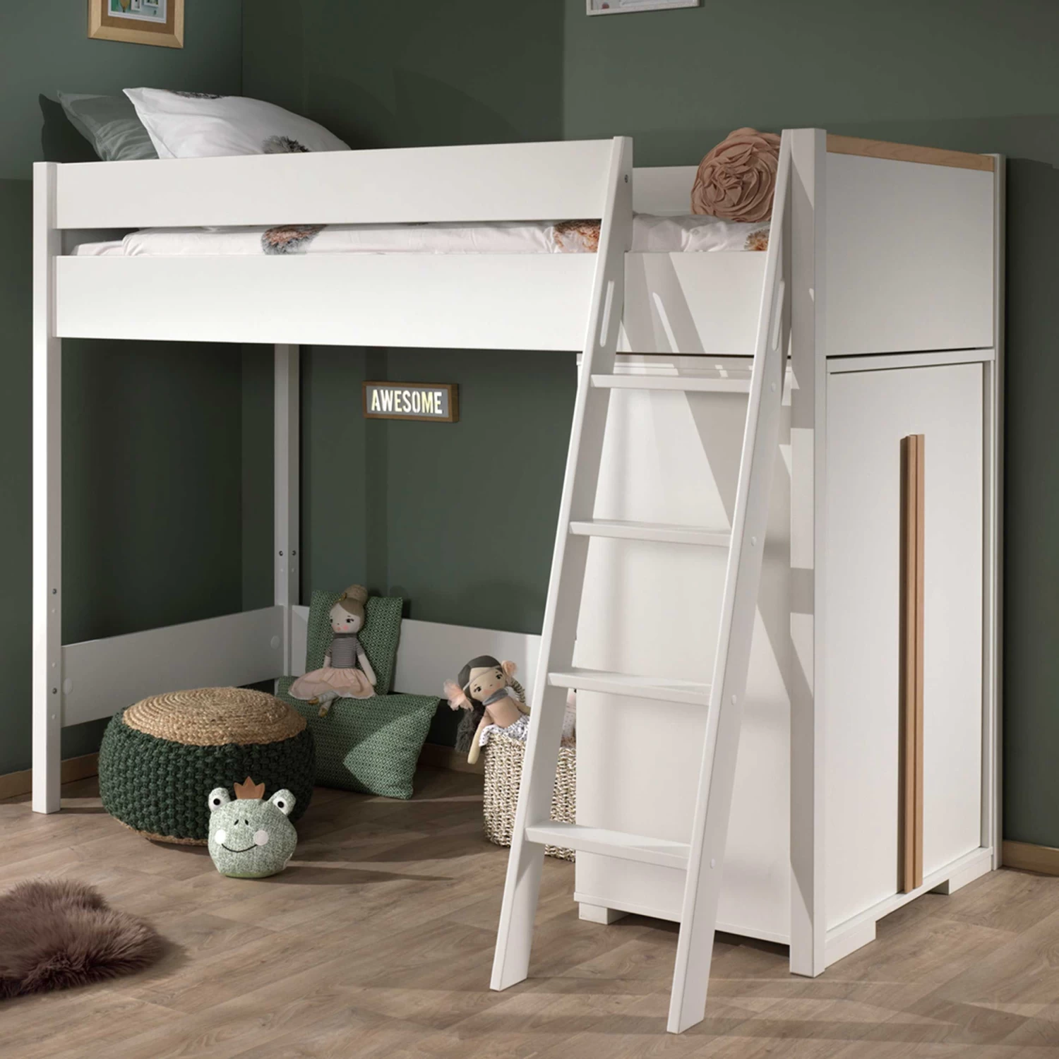 Witte hoogslaper London 90×200 uit spaanplaat. Inclusief lattenbodem en met bijhorende kast.