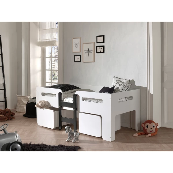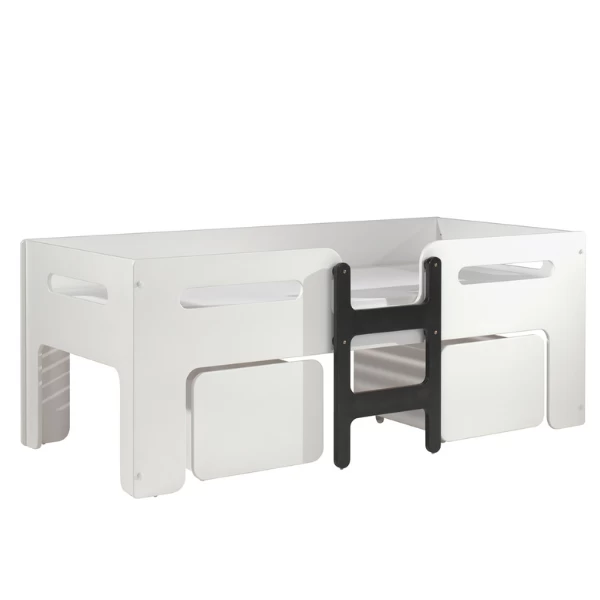 De Hoogslaper Luca is het perfecte bed voor wie een klassieke hoogslaper net iets te hoog vindt. Het bed is voorzien van een klein trapje in het midden met aan weerszijden extra opbergruimte. Matras en lattenbodem van 90×200 cm niet inbegrepen. De hoogslaper is gemaakt van wit gelakte MDF.