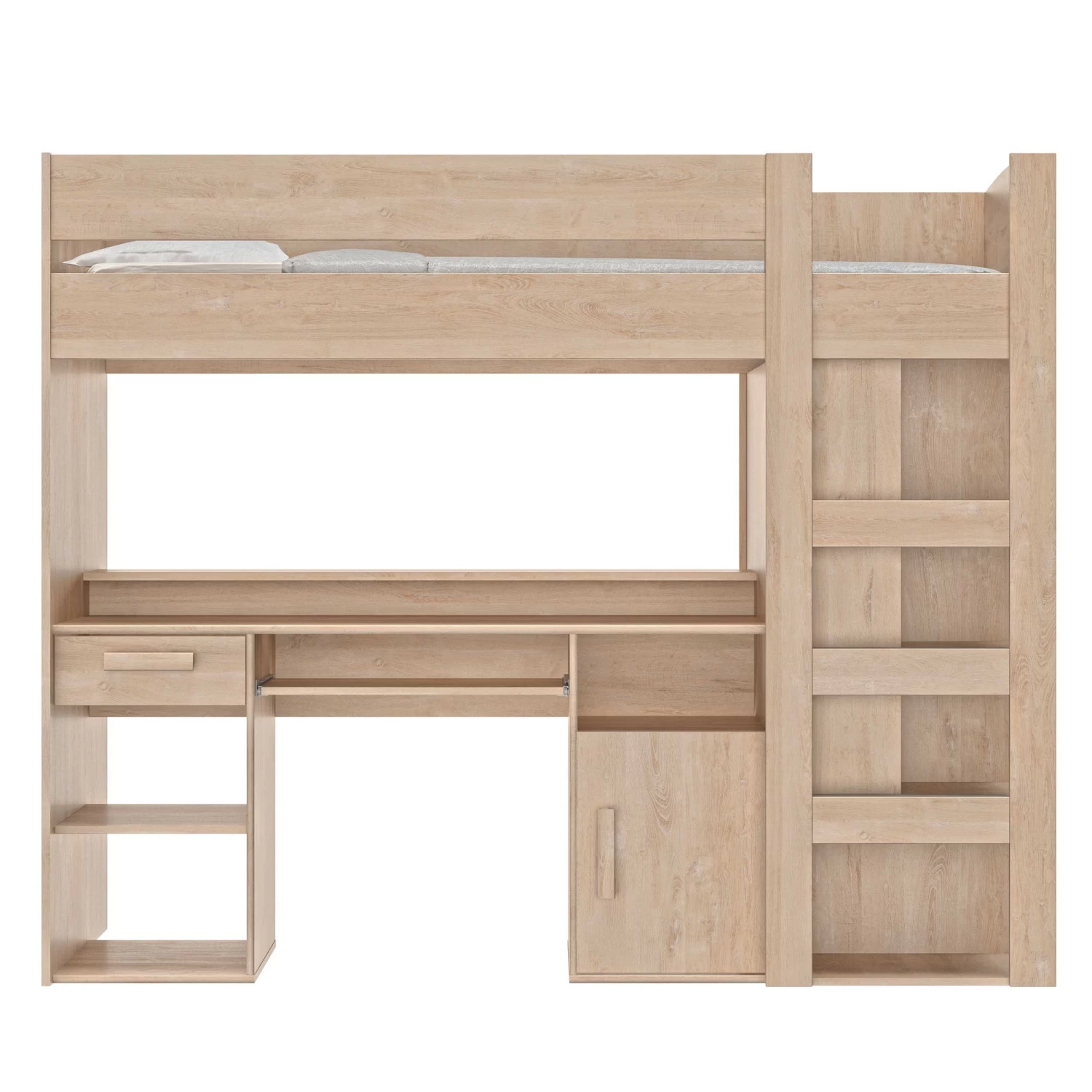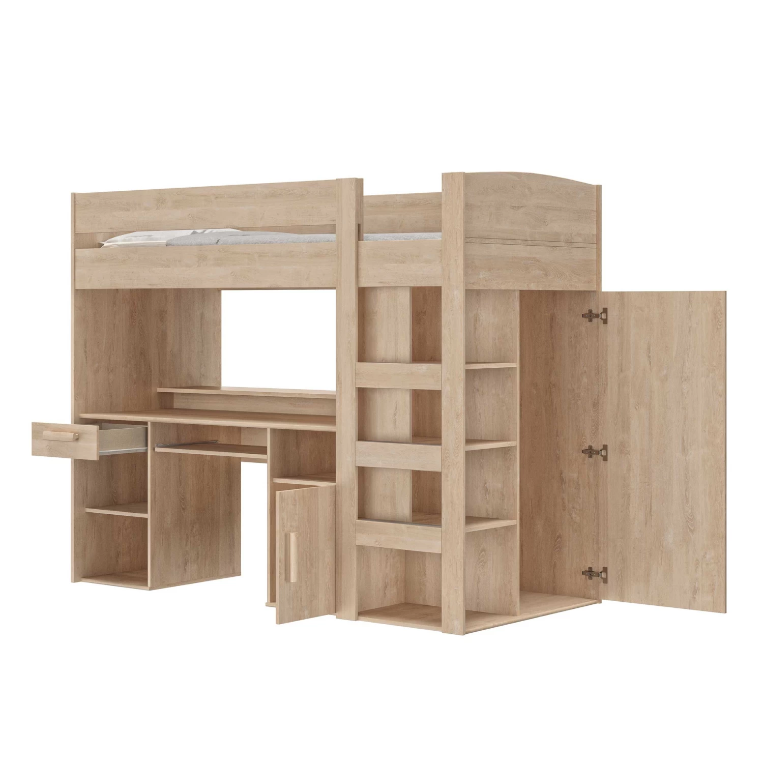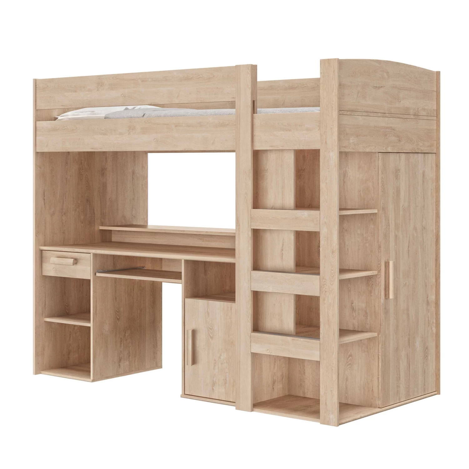 Deze hoogslaper is geschikt voor een matras van 90x200cm (apart verkrijgbaar op onze site). De lattenbodem is inbegrepen. De hoogslaper is bovendien uitgerust met een kast, 4 open vakken en een bureau en kan ook in spiegelbeeld gemonteerd worden.