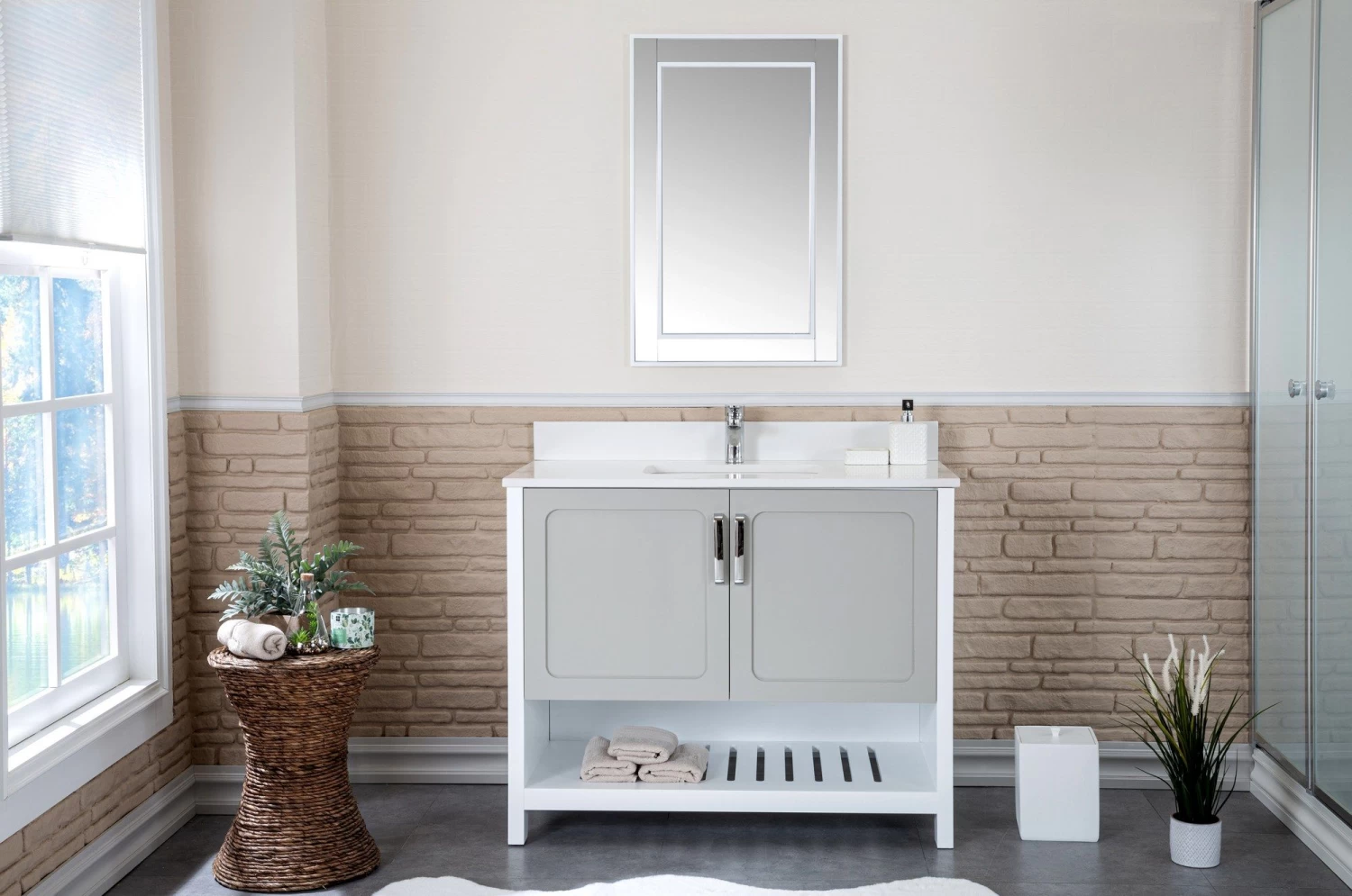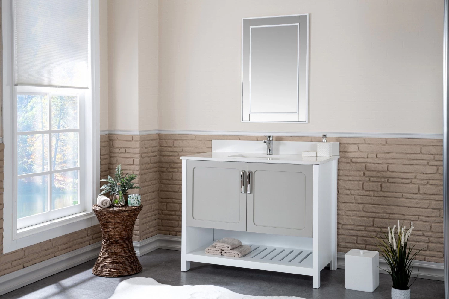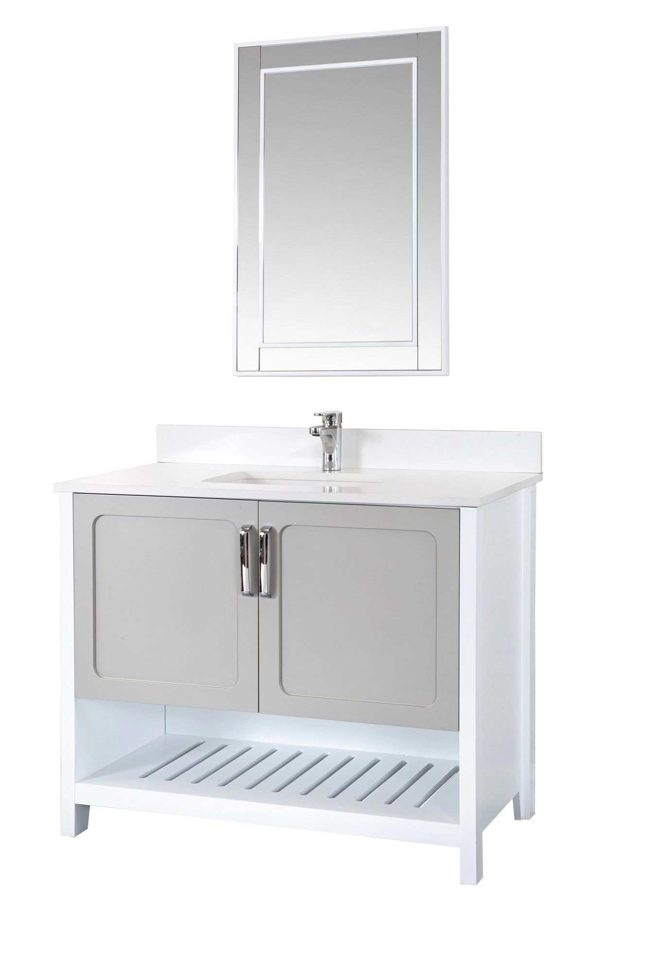 Jussara badkamermeubelset bestaat uit 2 delen gemaakt van massief hout en voorzien van een wit kwarts aanrechtblad, onderbouwwastafel, marinehouten lade en een flotale spiegel. Afmetingen zijn 105cm (B) x 22cm (H) x 56cm (D) met een grijs kleurenschema.