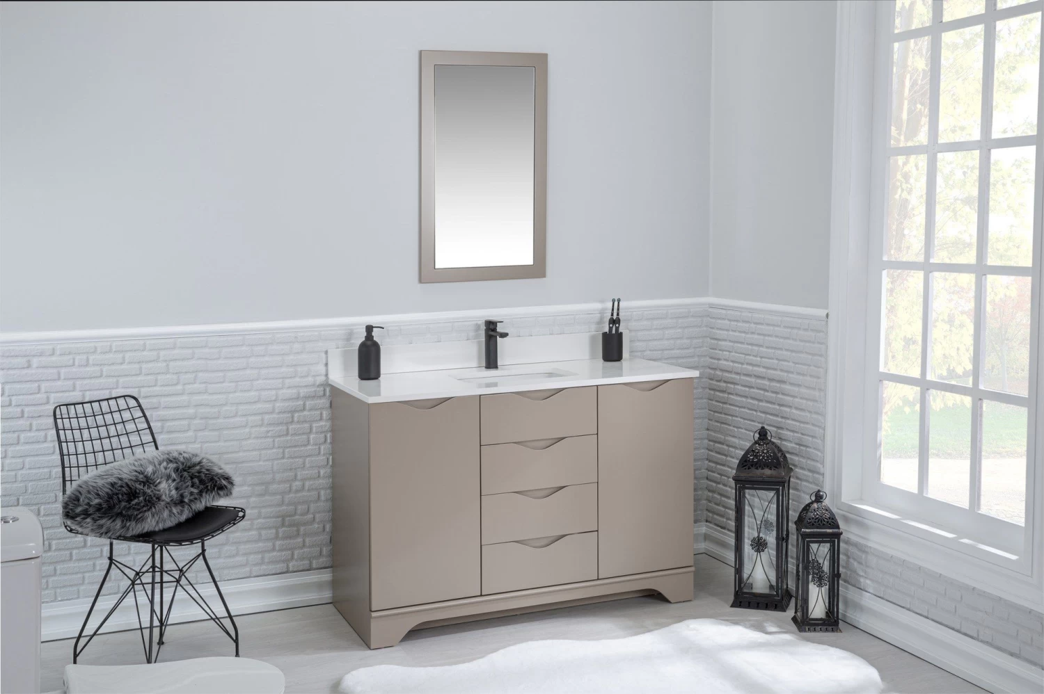 Maak kennis met de Jussara badkamermeubelset: een prachtige, 2-delige set van 100% gelakt MDF, met een aanrechtblad van wit kwarts met een porseleinen onderbouwwastafel, een lade van marien hout en een flotale spiegel. De veelzijdige kleur Cappuccino voegt elegantie toe aan elke badkamer. Afmetingen: Ijdelheid: 120x22x56cm, Spiegel: 55x80cm