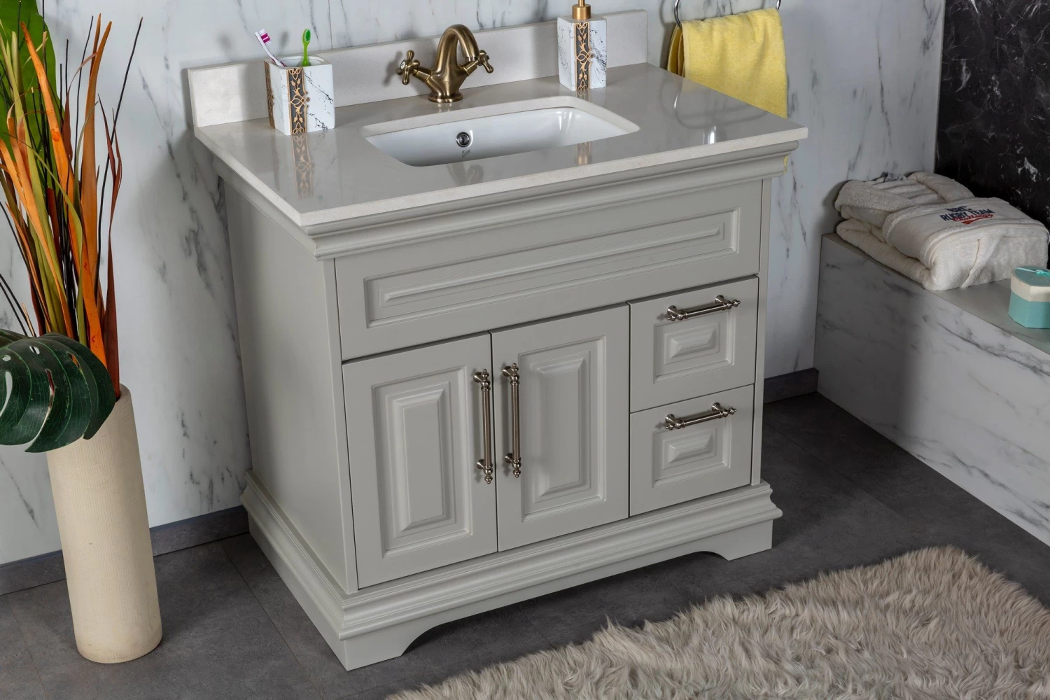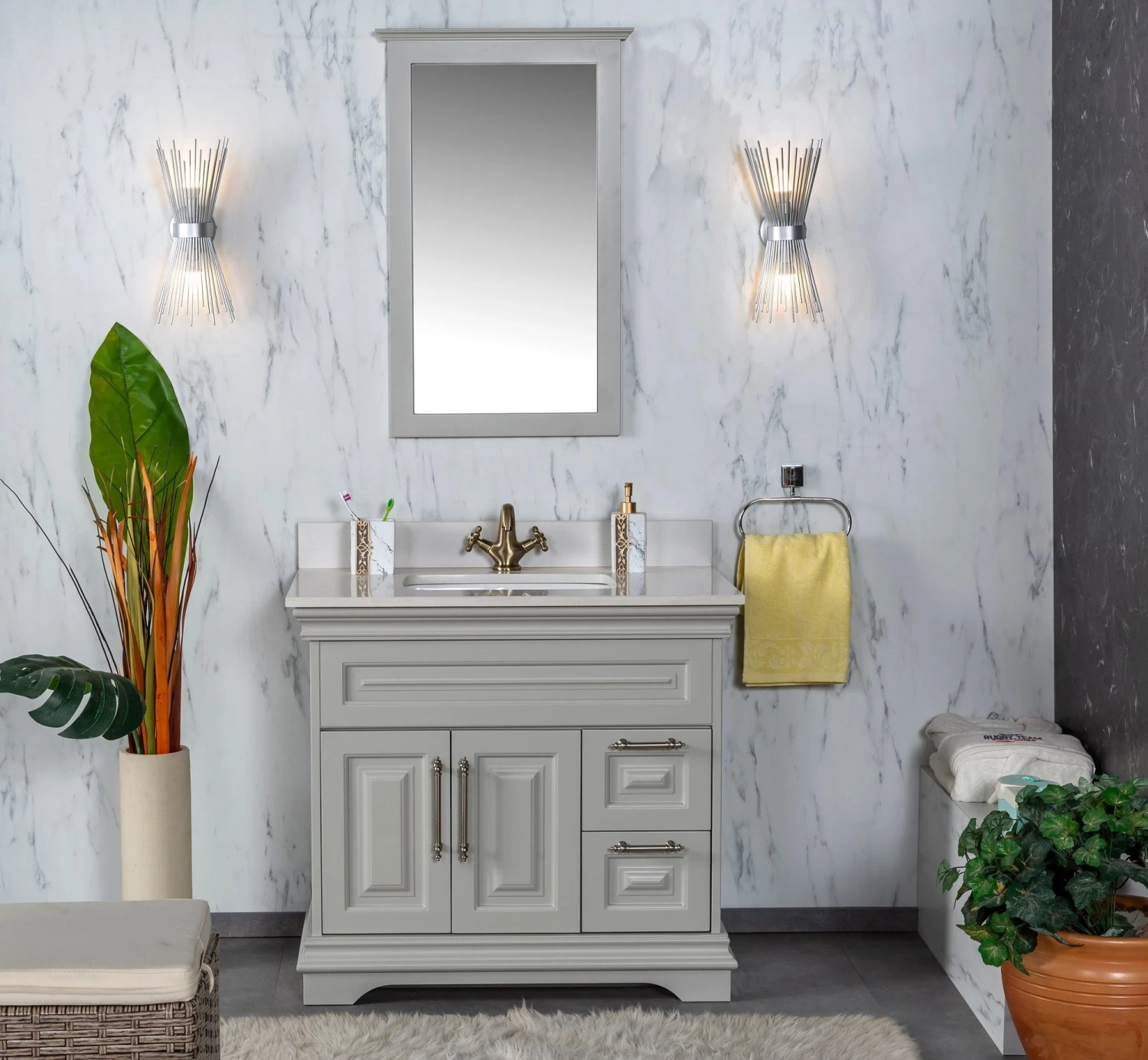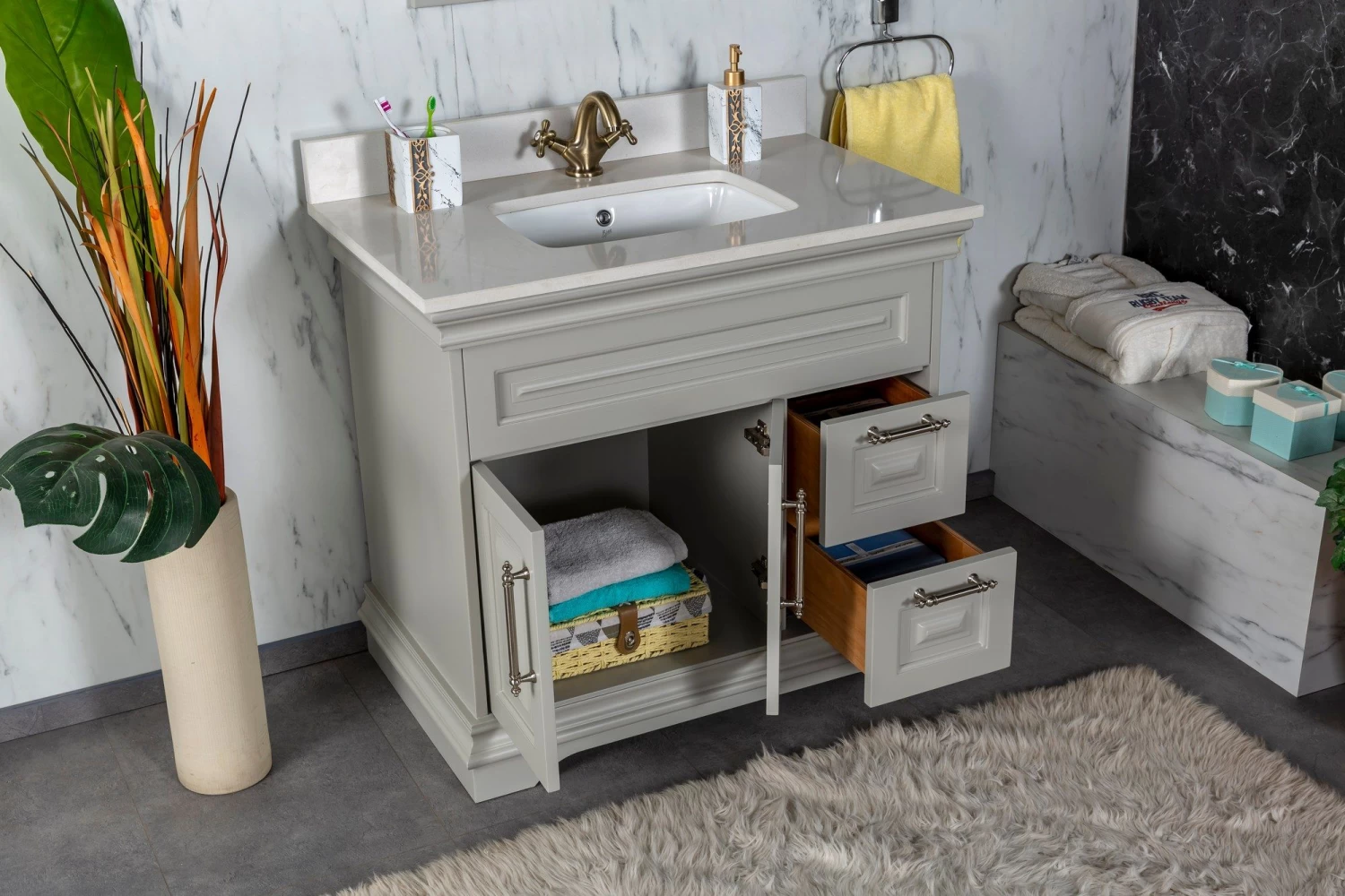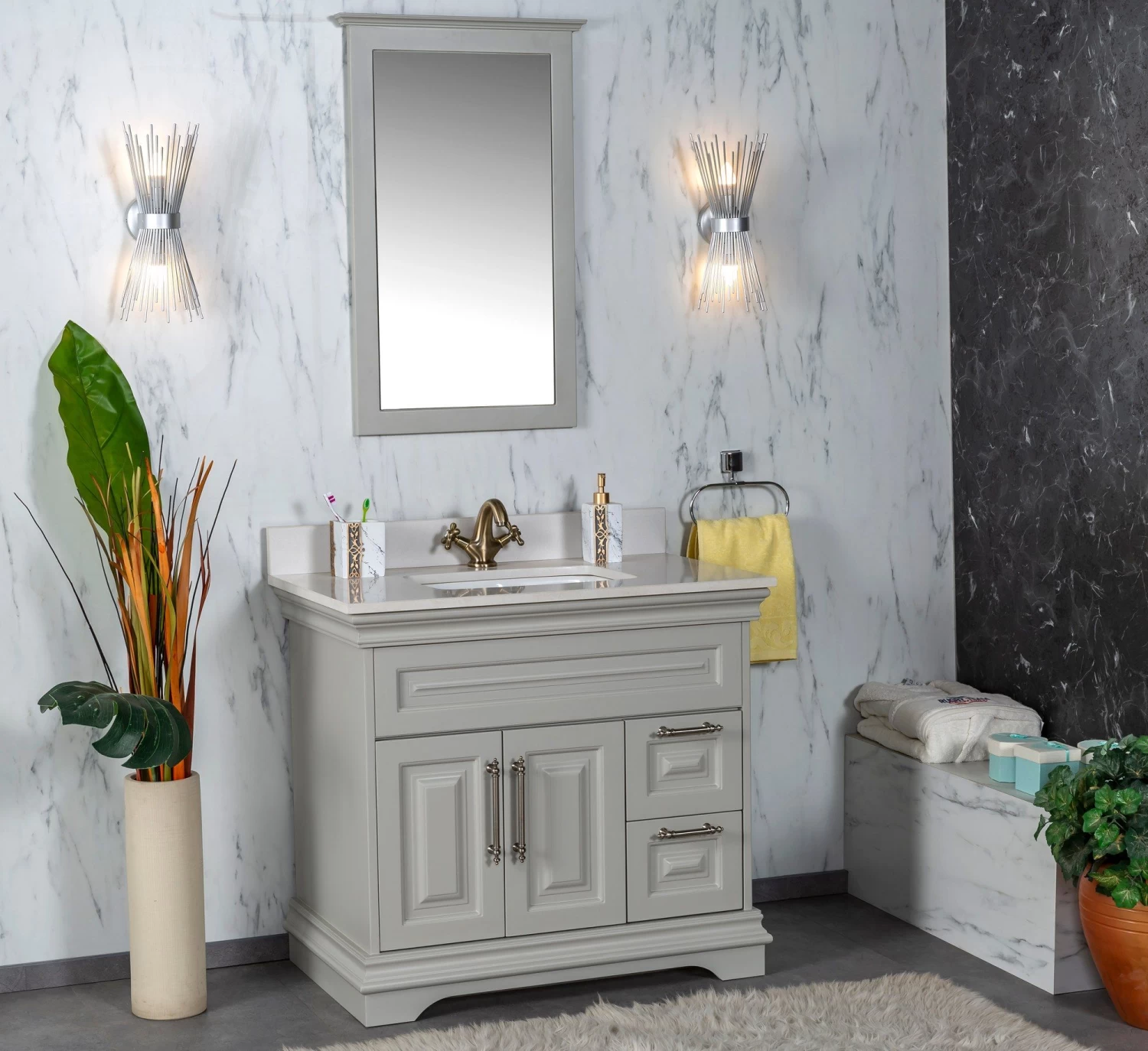 Jussara Badkamermeubelset: 2-delig, MDF Gelakt, Aanrechtblad Wit Kwarts, Grijze Kleur