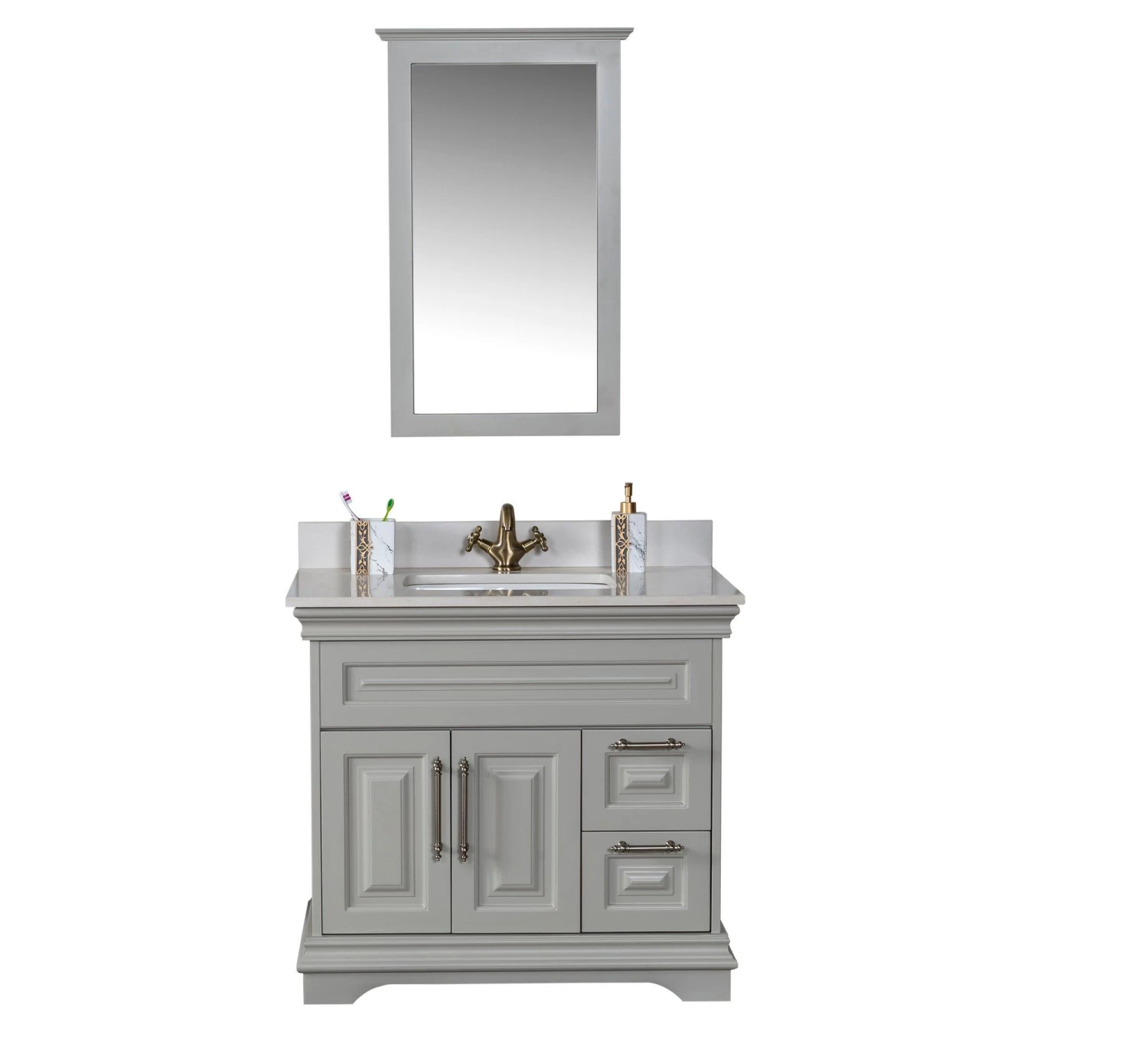 Jussara badkamermeubelset (2-delig) heeft een 100% gelakte MDF constructie, wit kwarts aanrechtblad met porseleinen wastafel, marinehouten lade, flotale spiegel en bronzen handgrepen. Het badmeubel is 90cm breed, 22cm hoog en 56cm diep, terwijl de spiegel 55cm breed en 80cm hoog is. Verkrijgbaar in Grijs