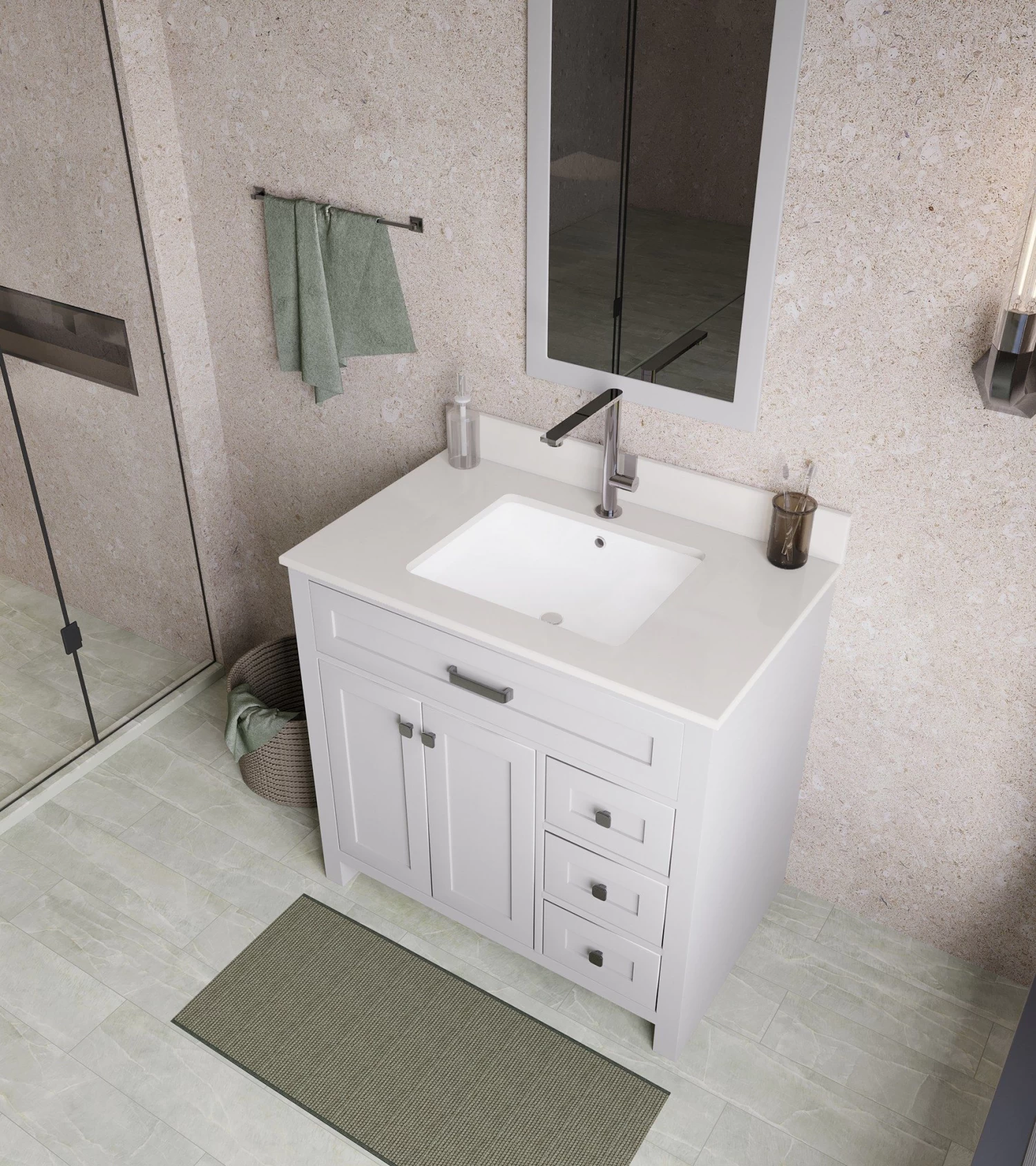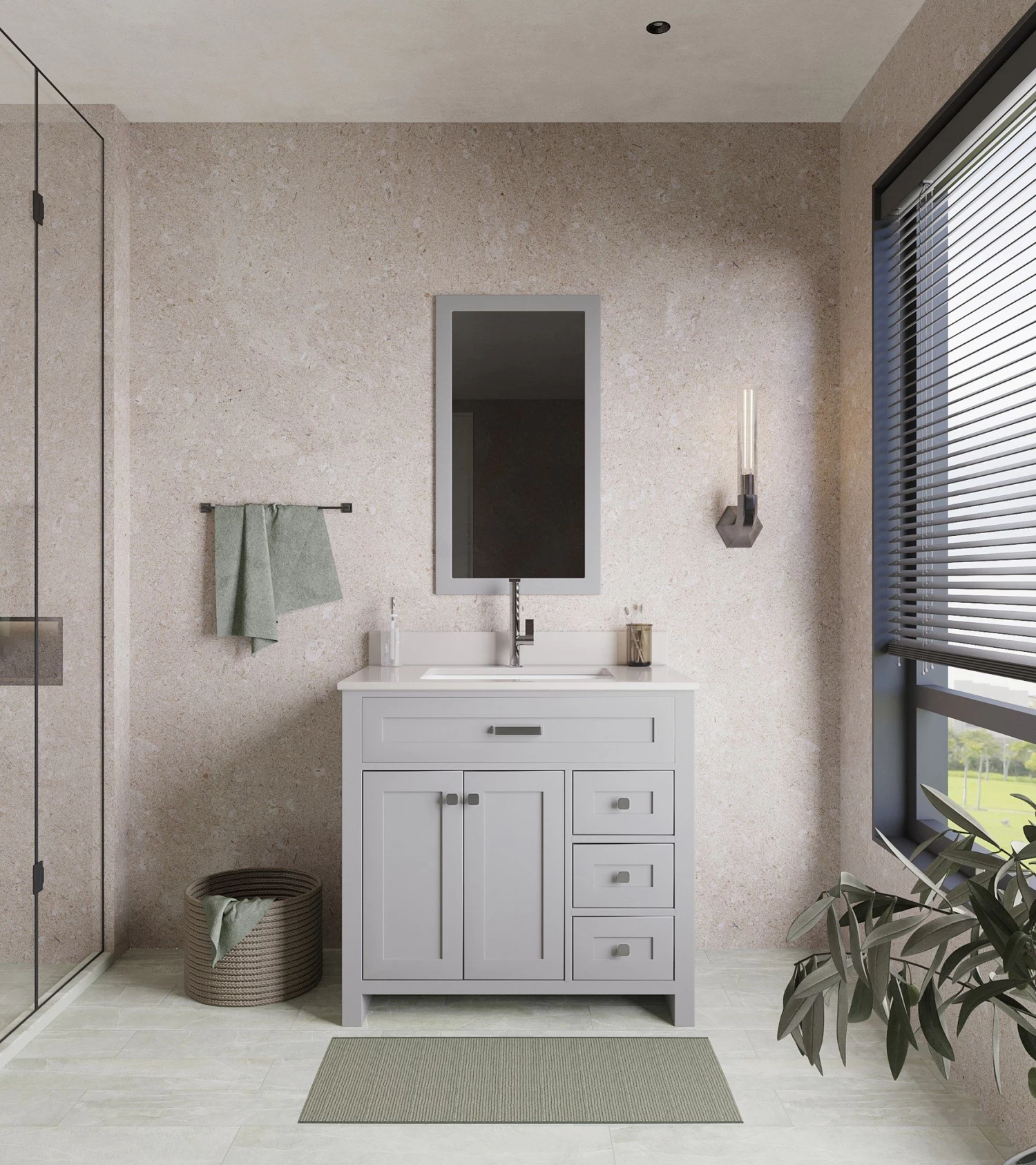 De Jussara badkamermeubelset heeft een 100% gelakte MDF constructie, een wit kwarts aanrechtblad met een porseleinen onderbouwwastafel en een vlakke spiegel. De set bevat ook chromen handgrepen en heeft een strakke grijze kleur.