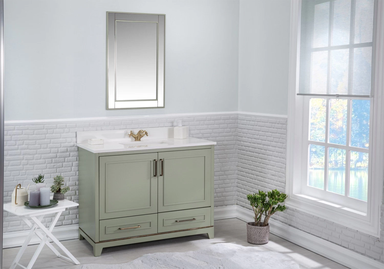 Jussara badkamermeubelset, gemaakt van 100% gelakt MDF en voorzien van een wit kwartsblad, marmeren lade, flotale spiegel en bronzen handgrepen. 105x22x56cm, groen