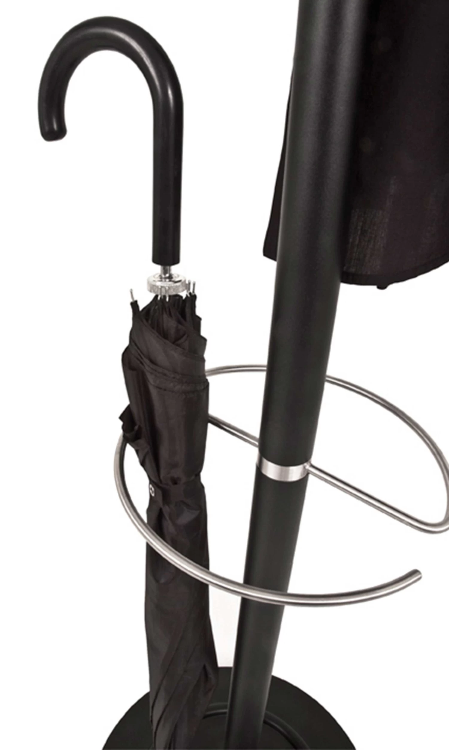 Staande kapstok Callum, gemaakt uit metaal en roestvrij staal. Uitgerust met acht kapstokhaken en een parapluhouderÂ