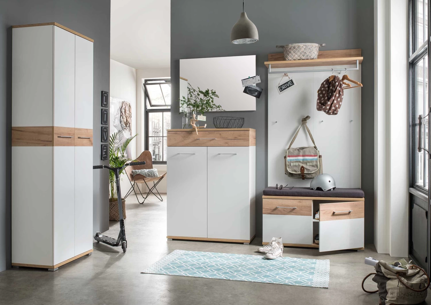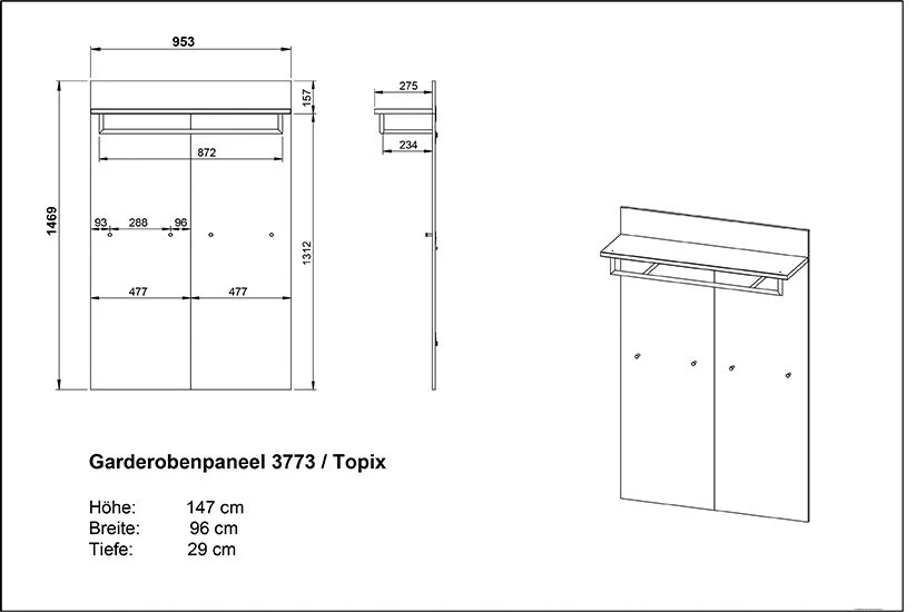 Deze Stoffel-reeks van Germania combineert een moderne look met Scandinavische accenten. Het hoofdzakelijk witte meubel, dat gemaakt is uit spaanplaat, contrasteert mooi met het eikdecor en geeft zo een trendy look. Dit kapstokmeubel is uitgerust met een kledingstang, een opbergplank en drie jashaken. Zo kan je niet alleen jassen en mantels, maar ook allerhande hoofddeksels, handtassen en andere accessoires opbergen. De hoogwaardige ABS-randen en de melaminecoating maken het meubel compleet. Ontdek de rest van deze reeks, het alternatief in wit met betondecor en de andere collecties van Germania op onze website!