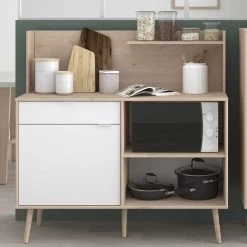 De Filipa-keukenkast heeft een simplistische design en is geïnspireerd door de Scandinavische stijl. Je kan deze keukenkast gemakkelijk combineren met verschillende stijlen. Deze kast brengt heel wat opbergmogelijkheden met zich mee dankzij haar deur, lade en drie legplanken. De Filipa-keukenkast is gemaakt uit spaanplaat met een deur en lade in het wit en de rest van de kast in eik decor.