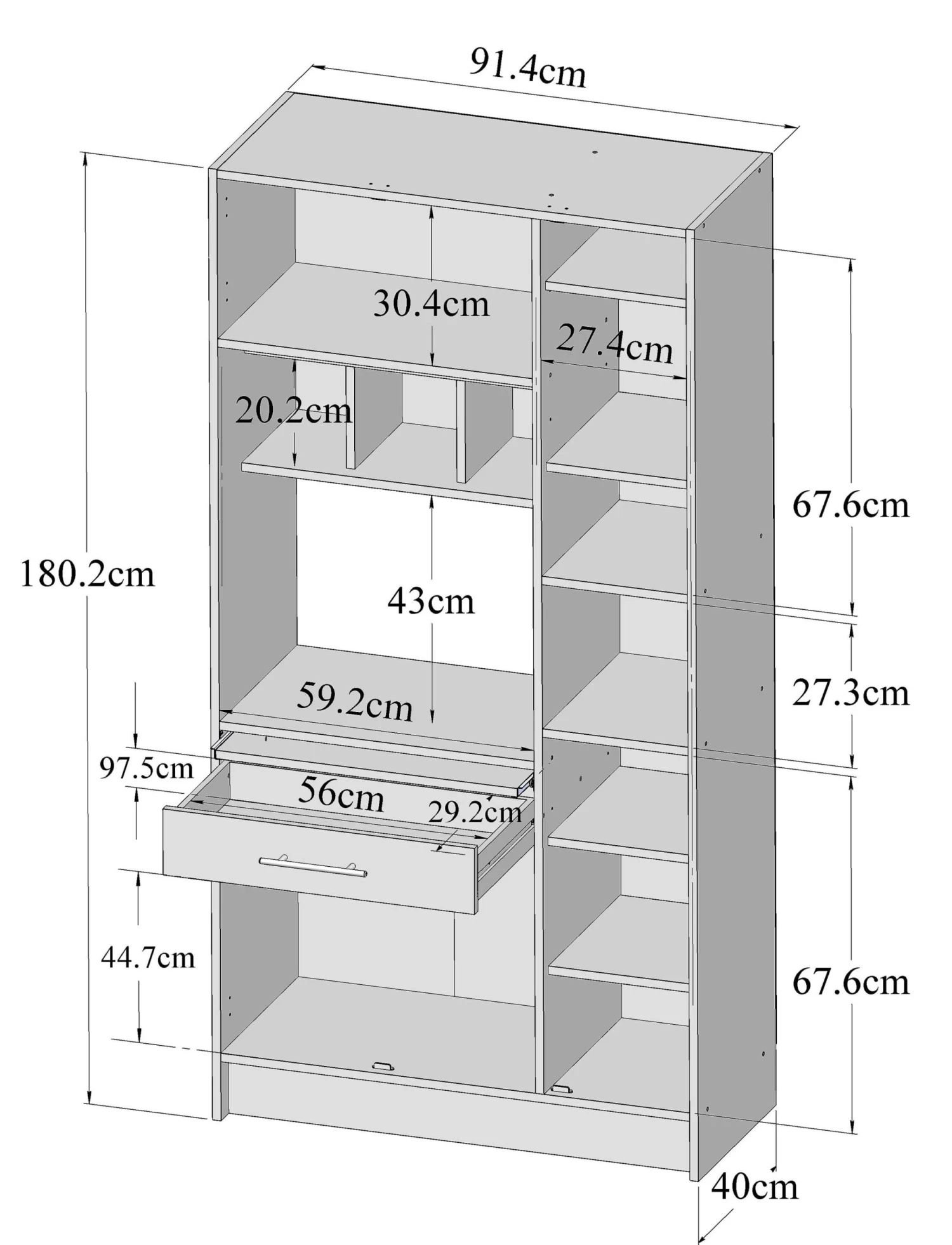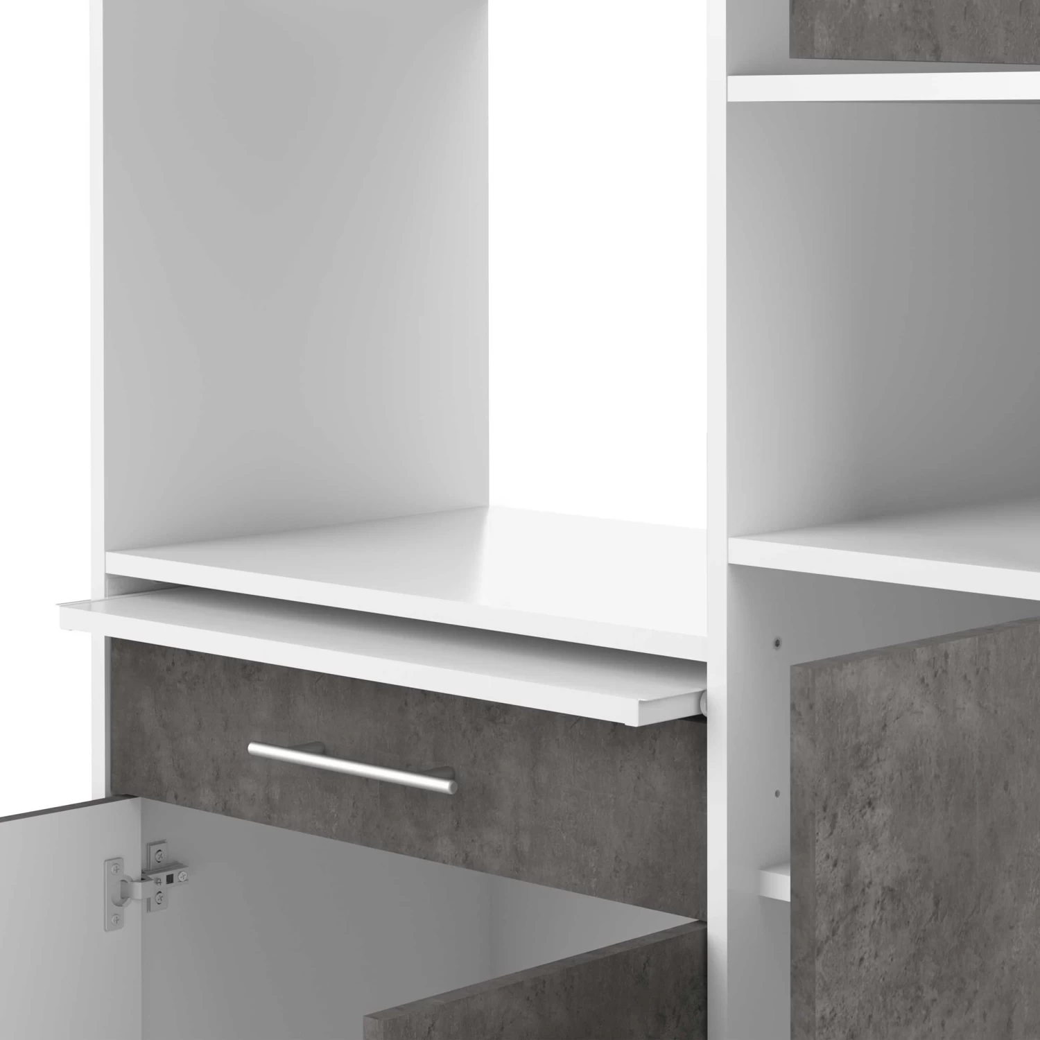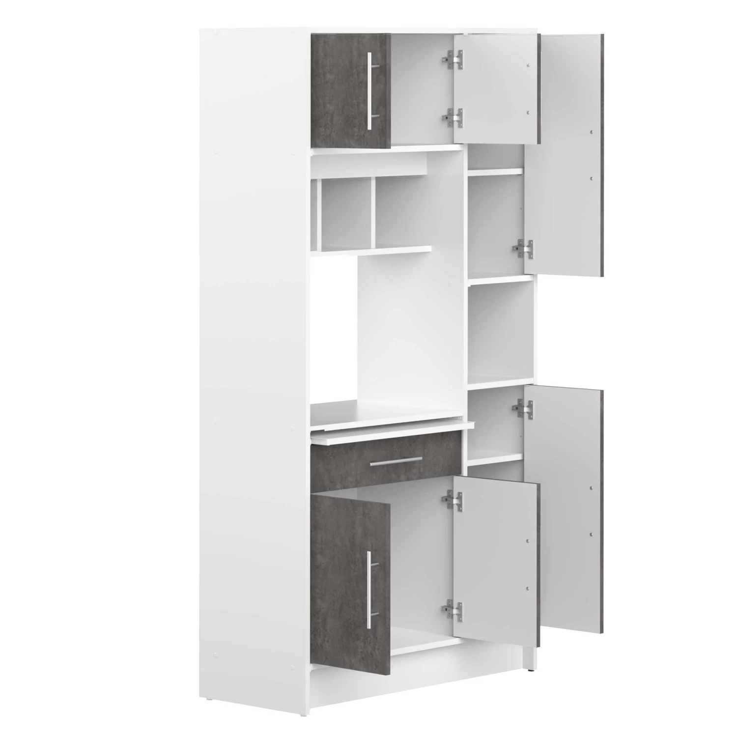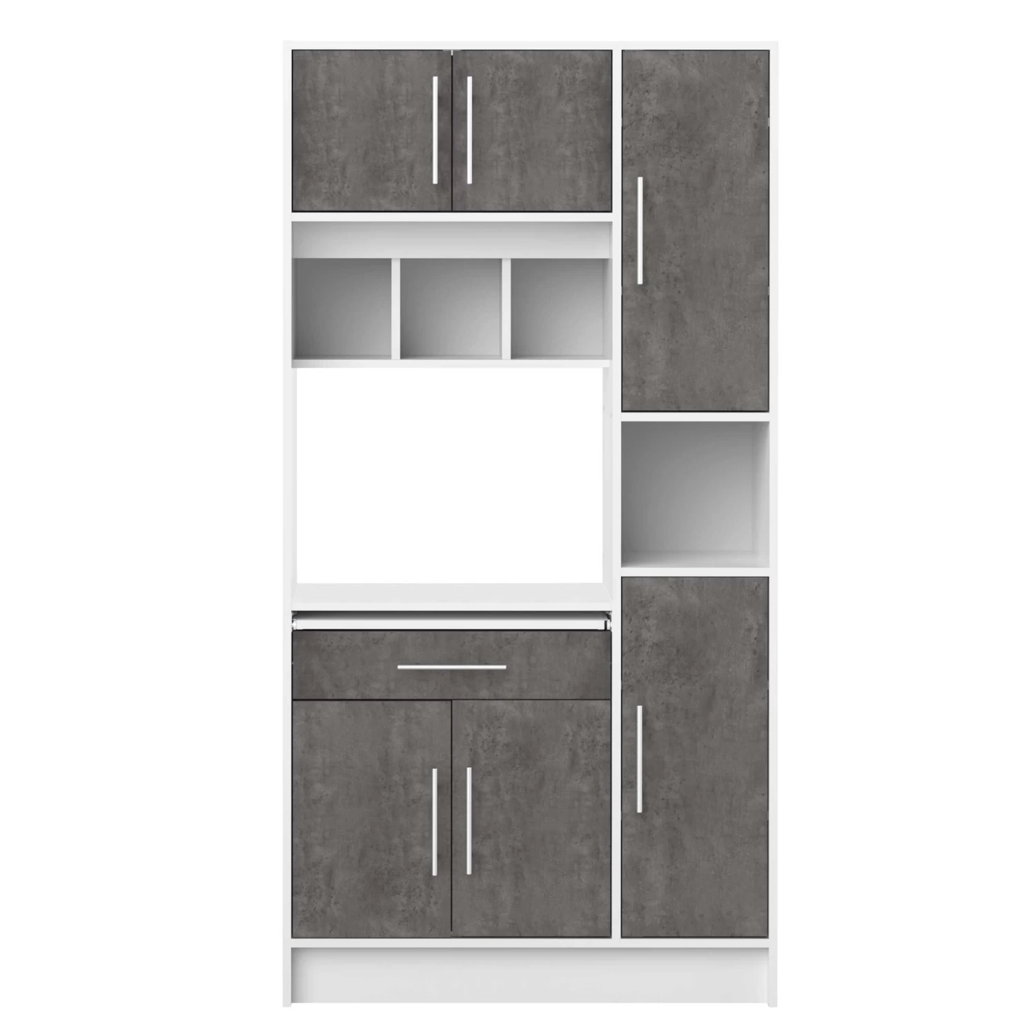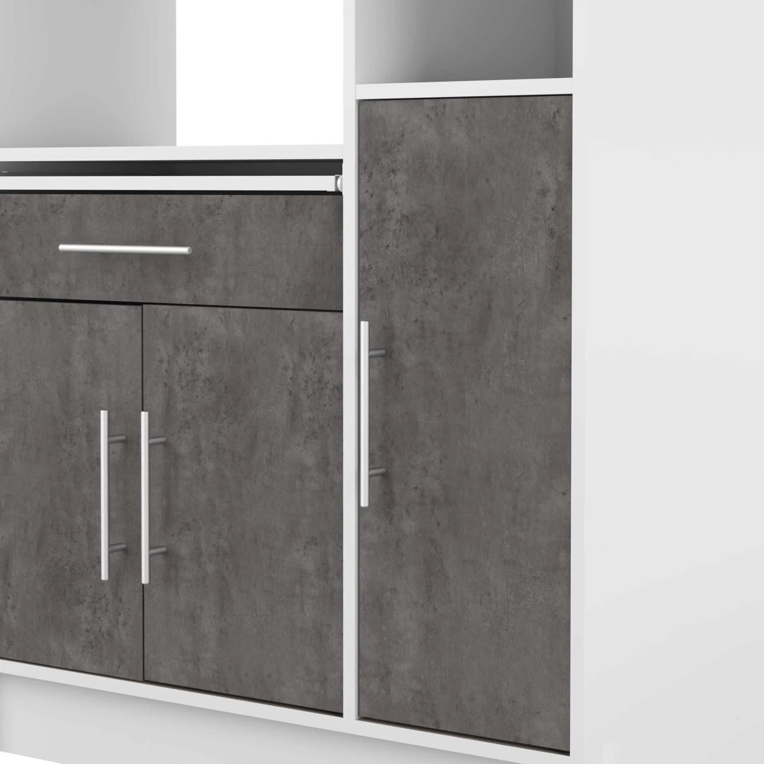 De witte kast beschikt in totaal over 6 deuren en een lade in betonlook, 5 open vakken met verschillende afmetingen alsook een uitschuifbare legplank onder het grote open vak. Keukenkast Liana is gemaakt van spaanplaat.