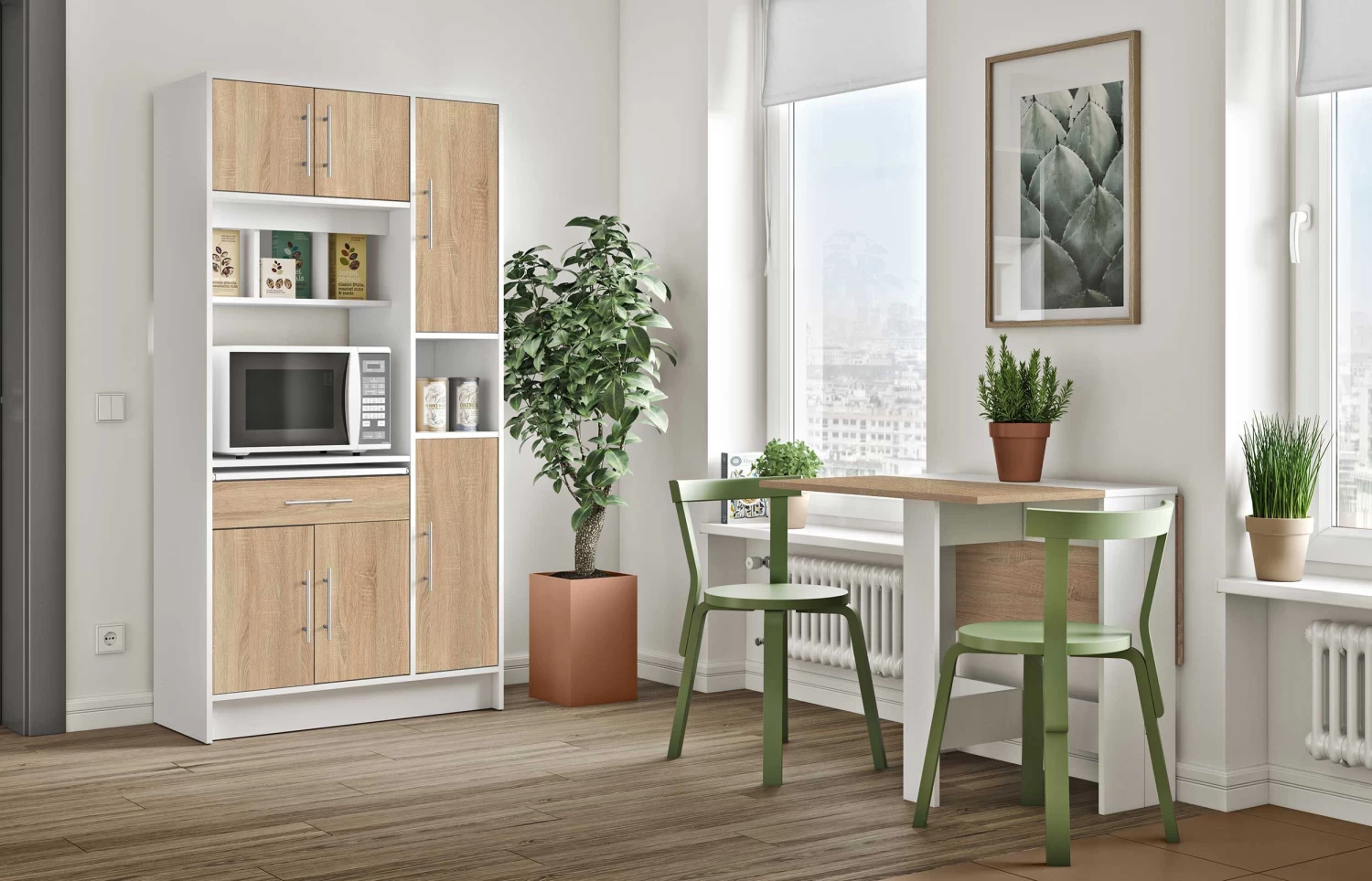 Deze praktische keukenkast met talloze opbergmogelijkheden biedt je de mogelijkheid om naast je microgolfoven heel wat andere keukenspullen op te bergen. Je kan de Liana-kast zelfs gebruiken als voorraadkast.