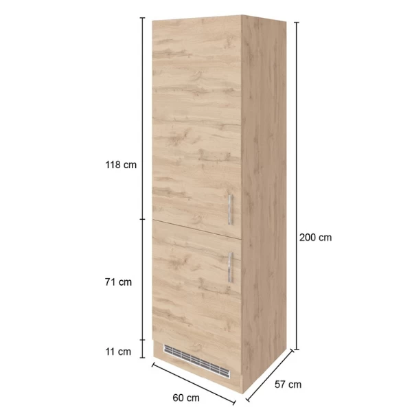 Keukenkast Sorrella 60x60x200cm uit spaanplaat met metalen handgrepen. Afgewerkt met melamine in eikdecor. Geschikt voor koelkast en diepvries. Keukentoestellen niet inbegrepen.Â