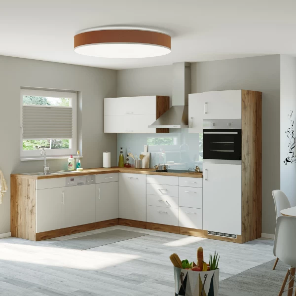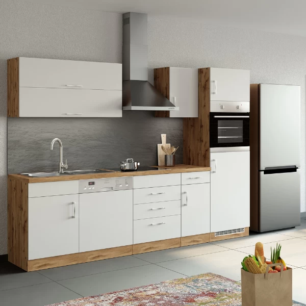 De keuken is het hart van het huis. Het is dus belangrijk om keukenkasten te kiezen die volledig aan je wensen voldoen. Deze keukenkast is gemaakt uit spaanplaat, afgewerkt met melamine in wit en eikdecor. De metalen handgrepen zijn een leuk detail. In de kast is ruimte voorzien om een kookplaat te monteren. De kookplaat zelf is niet inbegrepen. Verder is de kast voorzien van 3 lades waardoor je veel opbergruimte creëert voor allerlei kleine keukenitems. De collectie Sorrella bestaat in verschillende uitvoeringen. Stel zelf je droomkeuken samen.