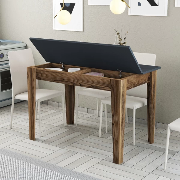 De Woody Fashion keukentafel is volledig gemaakt van gemelamineerde spaanplaat en wordt geleverd in een stijlvolle walnootkleur met antracieten details.