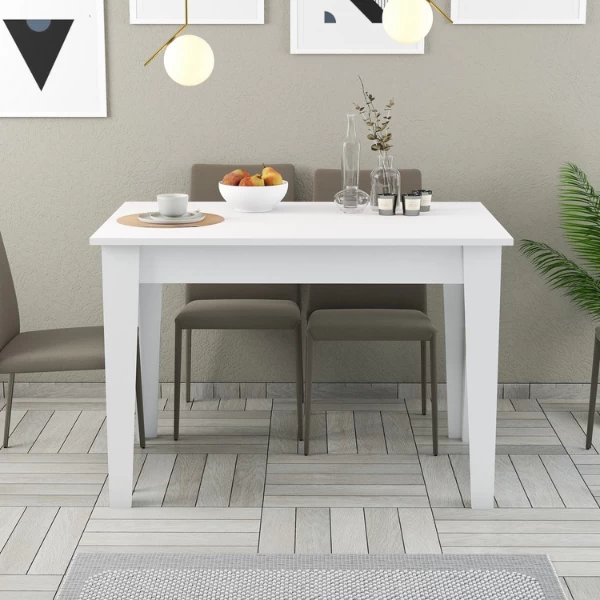De Woody Fashion keukentafel is volledig gemaakt van gemelamineerde spaanplaat en wordt geleverd in een strakke witte kleur.