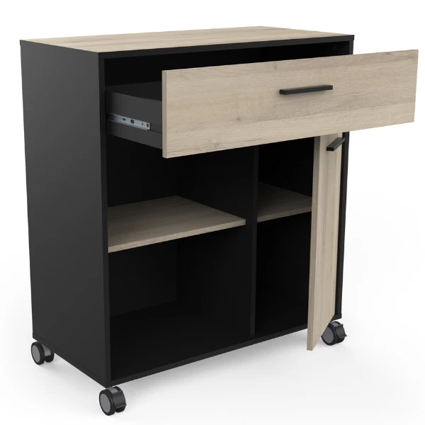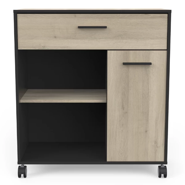 De combinatie van het strakke matzwart en het lichte kronberg eikdecor van keukentrolley Romanie is een echte voltreffer. Deze kast beschikt over een lade voor uw bestek, een open legplank en een legplank achter de draaideur voor allerhande keukengerei, kruiden, etc. Op het aanrecht is er plaats voor eventueel een microgolfoven of andere keukenapparaten. Dit handige kastje heeft wieltjes waardoor het gemakkelijk verplaatst kan worden.