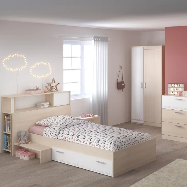 Kinderbed Charly, vervaardigd uit spaanplaat, is geschikt voor een matras van 90 x 190 cm. De bedlade, ideaal om beddengoed in op te bergen, en het opstapje kunnen aan beide kanten van het bed gemonteerd worden. De achterbouw van het bed (optioneel) is perfect om te gebruiken als boekenkast. Dit bed, van het Franse merk Parisot, is ook beschikbaar als halfhoogslaper.
