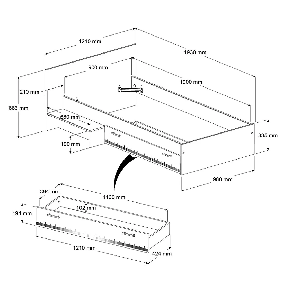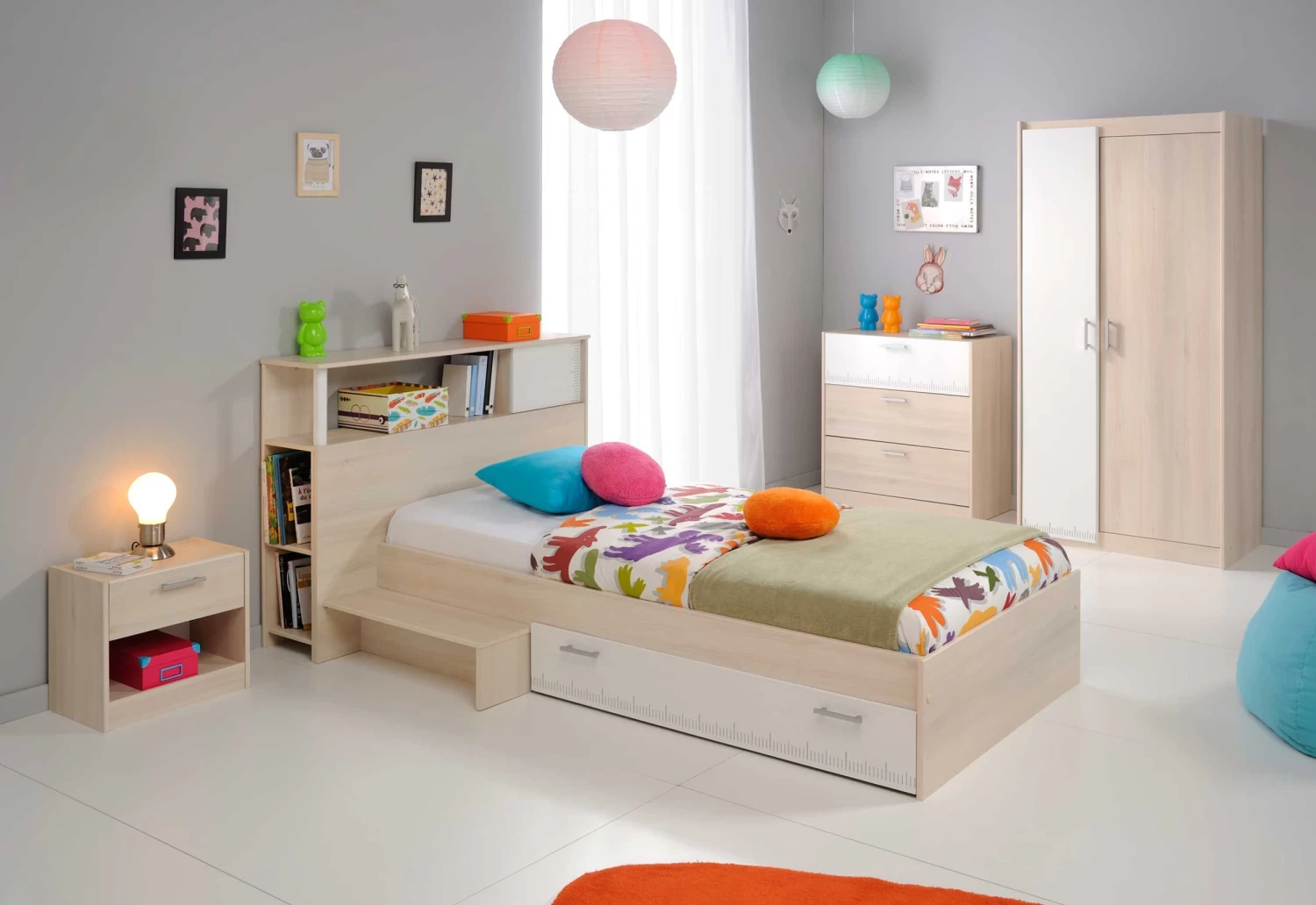 Kinderbed Charly, vervaardigd uit spaanplaat, is geschikt voor een matras van 90 x 200 cm. De bedlade, ideaal om beddengoed in op te bergen, en het opstapje kunnen aan beide kanten van het bed gemonteerd worden. De achterbouw van het bed (optioneel) is perfect om te gebruiken als boekenkast. Dit bed, van het Franse merk Parisot, is ook beschikbaar als halfhoogslaper.
