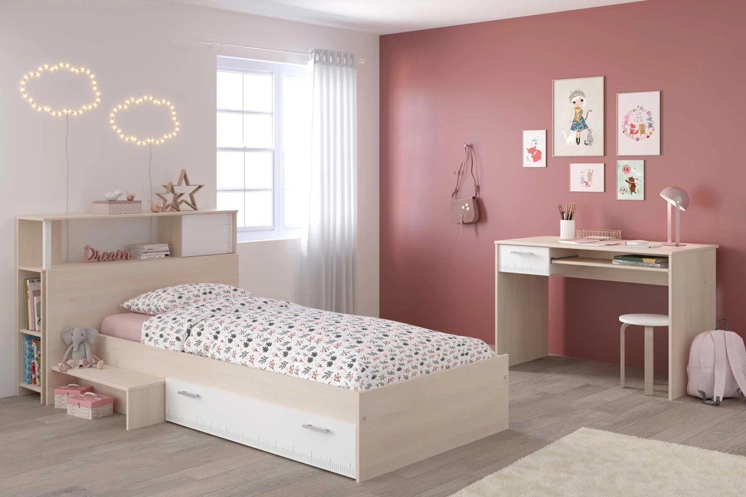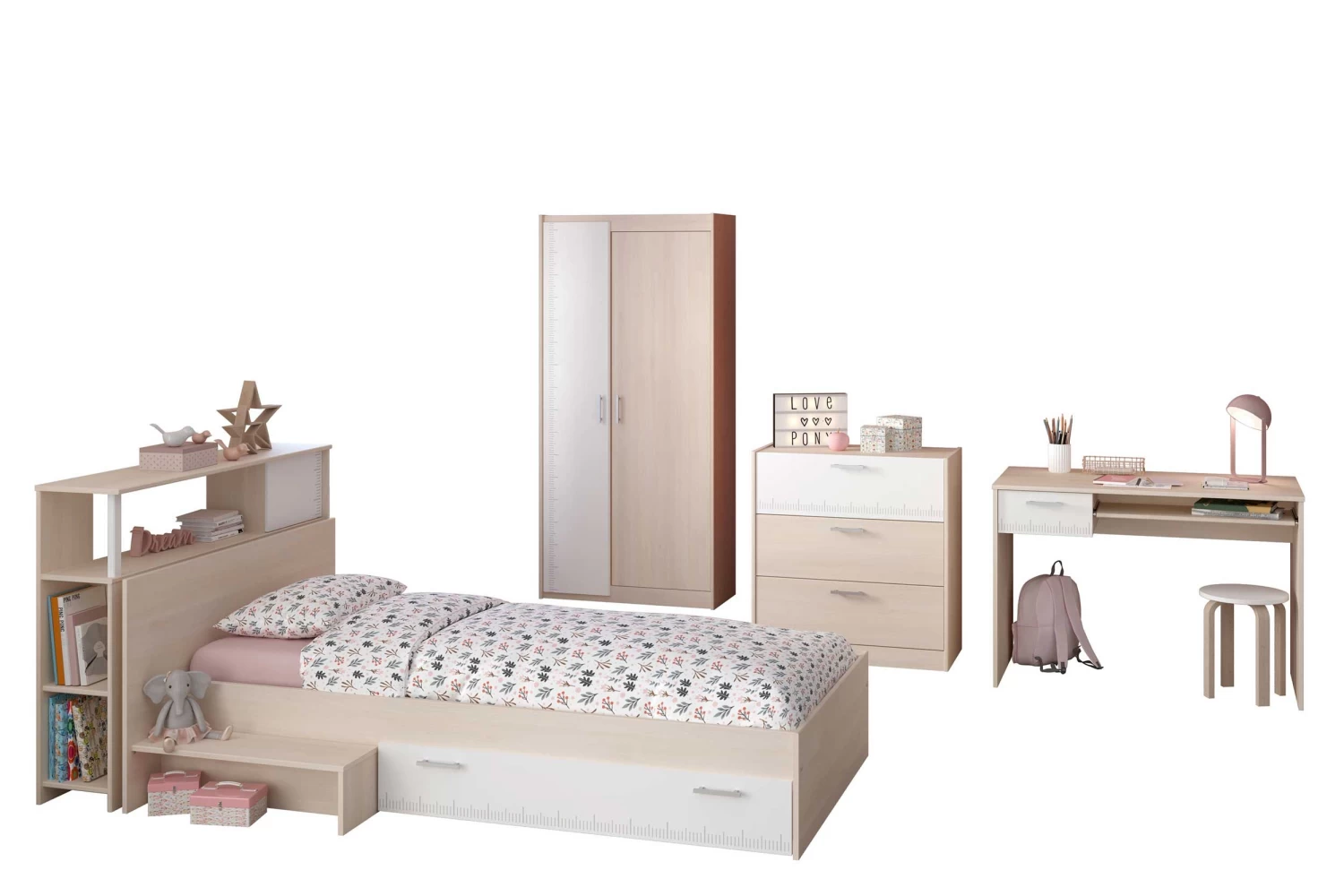 De Charly collectie herken je meteen aan het stijlvolle design. De meubelen zijn lichtbruin en hebben witte accenten.