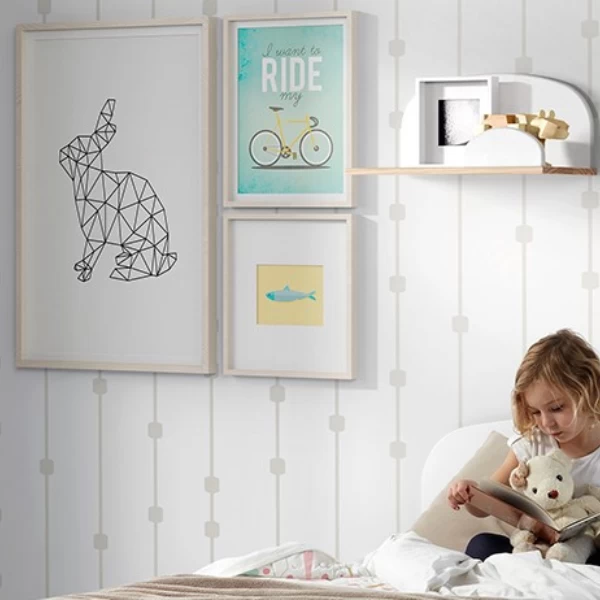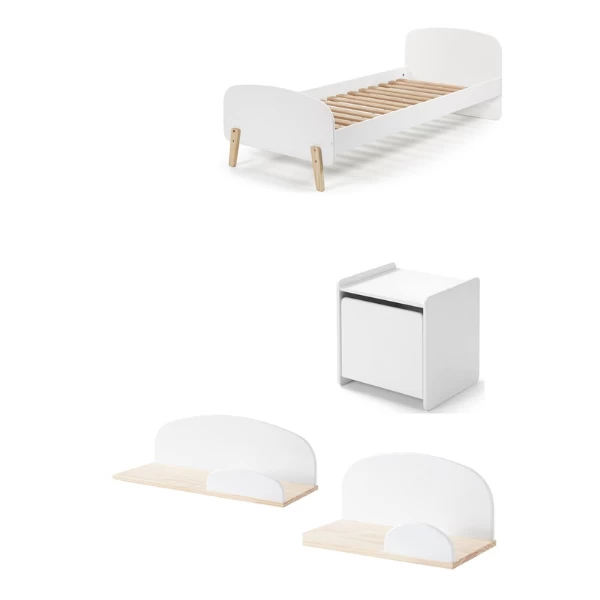 Kinderkamer Kiddy bestaat uit een bed 90×200 cm met lattenbodem (matras van 90×200 cm niet inbegrepen) , nachttafel 40x36x41 cm, een wandplankje van 65x25x22 cm en een wandplankje van 45x25x22 cm .